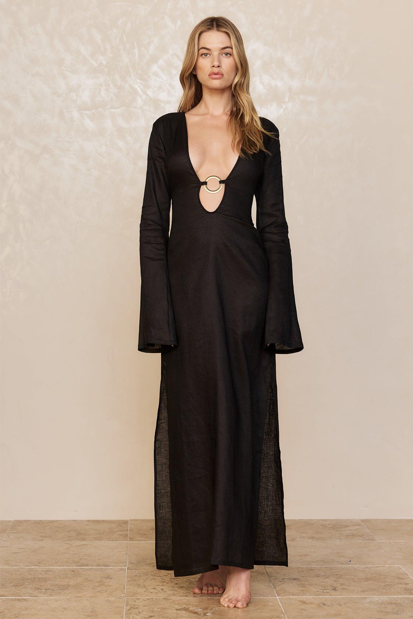 Standout Glamorous and chic! This Montego Dress will make you feel like a star. Made in an airy linen, this elegant dress with a plunging neckline, gold ring detailing and high side seam slits will make you brighten up any room you walk in. Paired with any of our swim, this dress will elevate any beach look!Features:Plunging neckline w/ center front gold ring detailAdjustable back tieLong flared sleevesMaxiUnlined, sheer Care:Hand wash cold. Do not bleach or soak. Do not tumble dry. Cool iron on reverse. Dry clean.