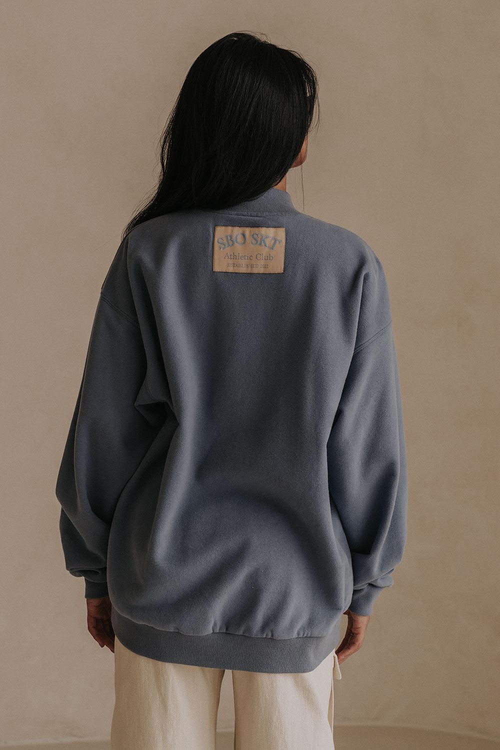 Introducing our Montpellier Sweater, made from a high quality cotton blend fleece lined sweater fabric in a dusty blue hue. It is a relaxed style featuring boxy full length sleeves, ribbed trims, zipper at centre neck with SBO SKT puller and patch and embroidered details throughout. Pair with relaxed pants! Designed exclusively by Sabo.