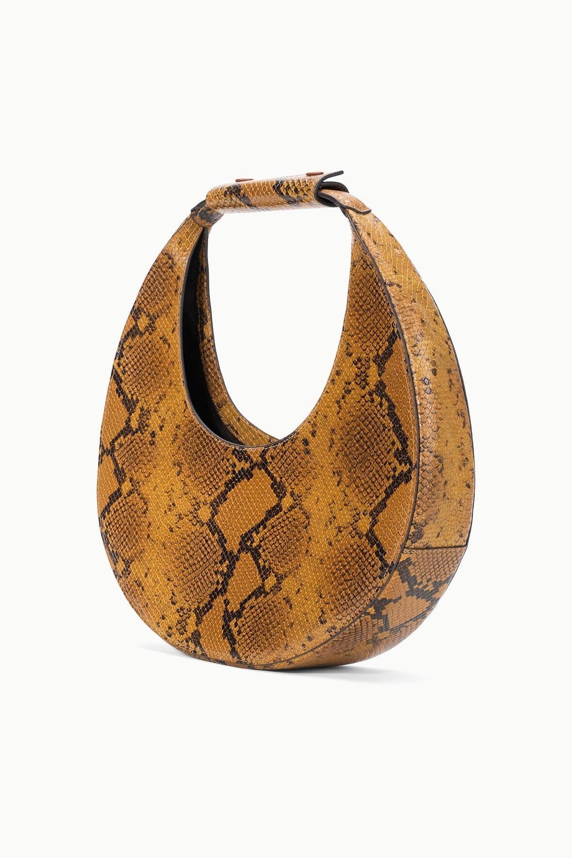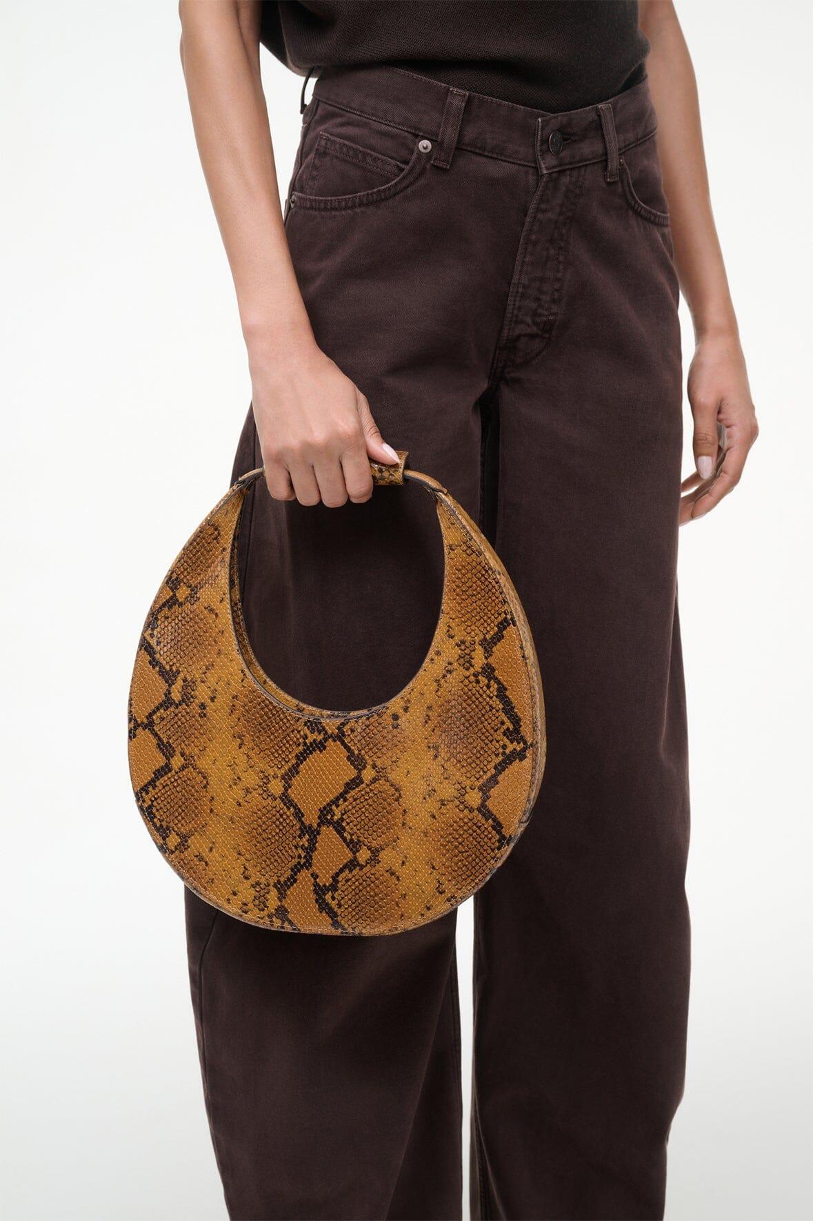 The Moon Bag is a crescent moon shaped tote with a curved handle with removable STAUD-embossed accent. This style features an inner suede lining and a magnetic clasp closure to hold your essentials; can be worn handheld or over the shoulder.