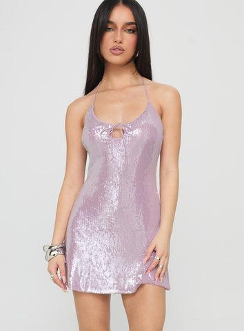 Sequin halter mini dress Front cut-out with tie detail, adjustable halter straps, low back, zip closure at back Non-stretch material, fully lined Princess Polly Lower Impact Main: 100% reclaimed PET, Back: 95% polyester 3% elastane, Lining: 95% polyester 3% elastane Cold hand wash