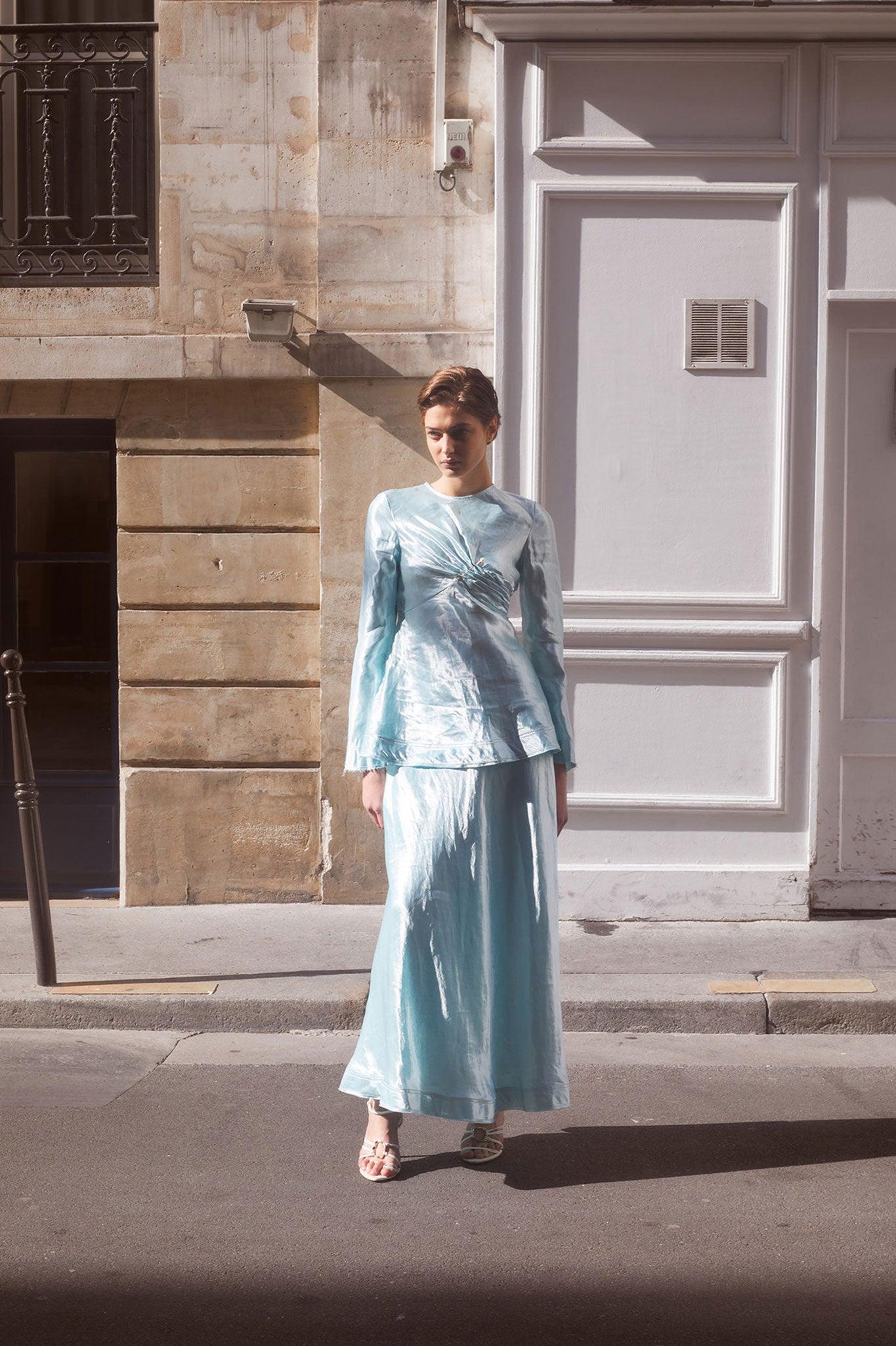 PRODUCT DETAILS Fit-and-flare silhouette Flared sleeves Crew neckline Centre tucking Ruched details Faux pearl pin embellishment Zip up closure Shop All Tops SIZE AND FIT Model wears a size AU 8/S Model: 172cm/5’7 Bust: 77cm Waist: 58cm Hips: 88cm FABRICATION 69% Linen 31% Viscose Dry Clean Only