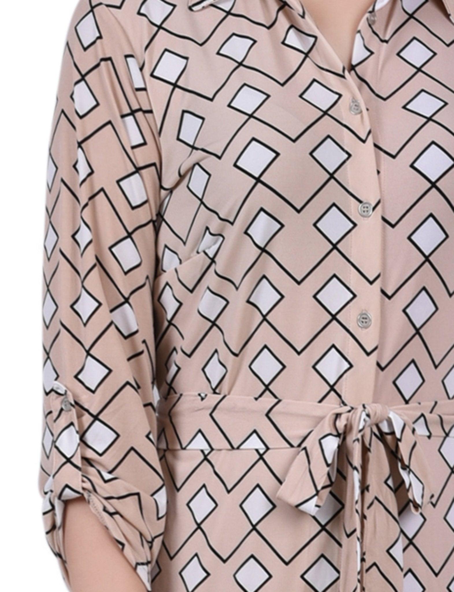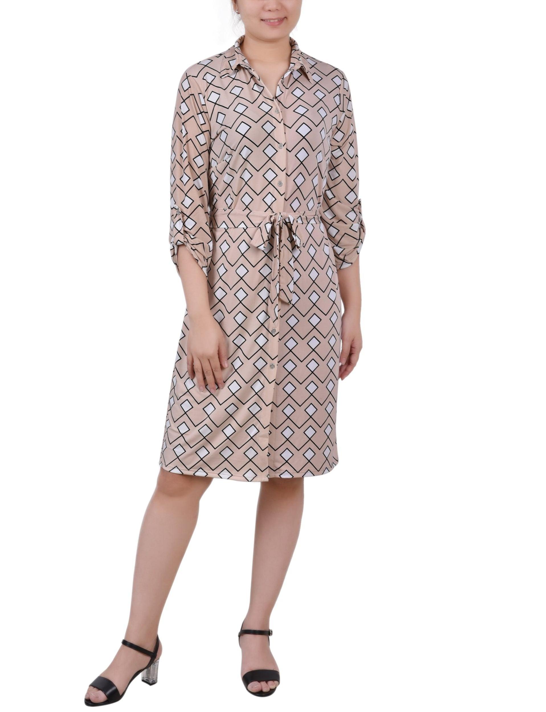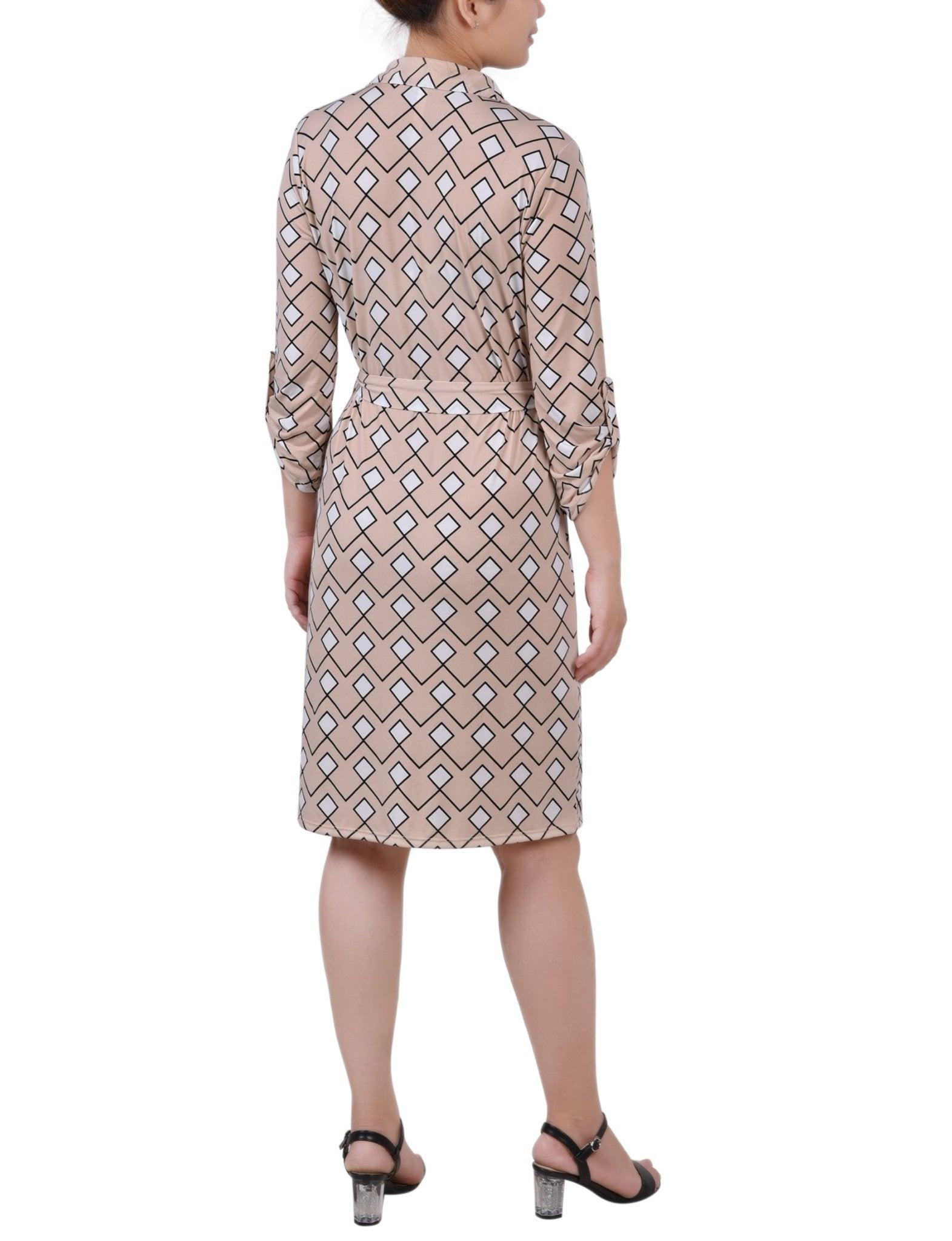 Peach Amber Geo 3/4 Roll Tab Sleeve Belted Shirtdress - Petite