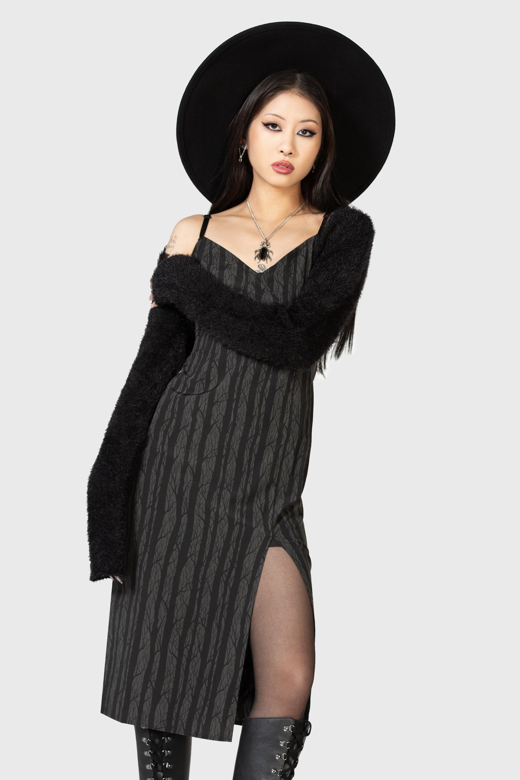 MOONLIT BLOOM.- Soft, stretch fabric.- Statement silhouette woodland print.- Midi length.- Adjustable shoulder straps.- Rear zip closure.- Side split.- Fitted.With KILLSTAR branding, 96% Polyester, 4% Elastane.Machine wash cold (30°c) / Do not bleach / Do not tumble dry / Iron at low temperature / Do not dry clean. Imported.