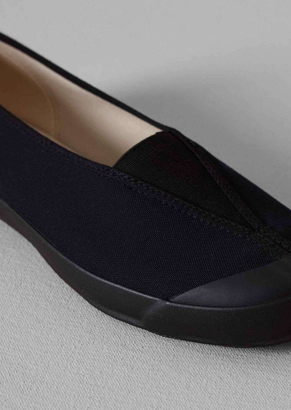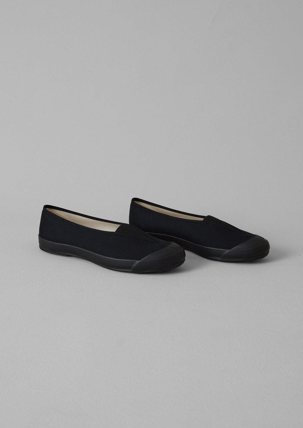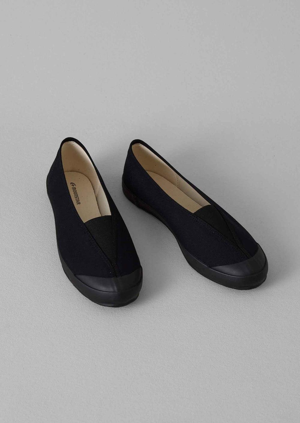 Cotton canvas pumps with a comfortable elasticated band. Handmade in Kurume, Japan by Moonstar, a company established in 1873. A vulcanised rubber brings durability and flexibility while ensuring the shoe holds its shape.