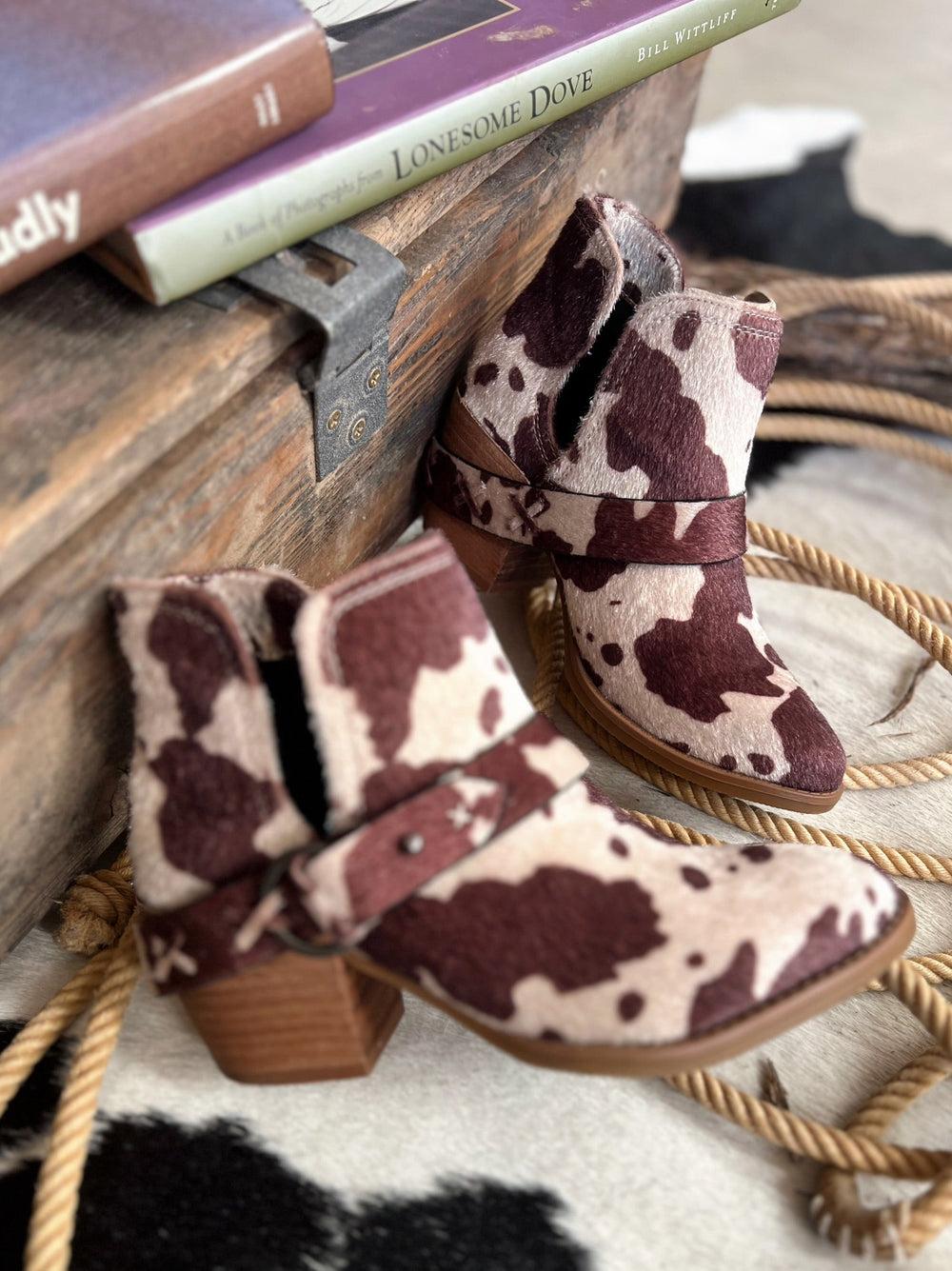 Step up your style game with the Moove Out The Pasture Booties! Featuring a bold cow print faux fur, 2 1/2" wood heel, 6" total height, plus inside and outside ankle slits and a wrap around ankle strap, these booties will take your look to the next level. Show ‘em you mean business!