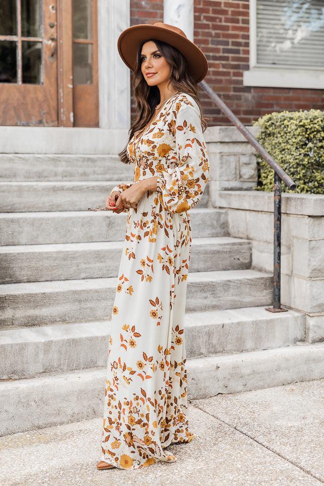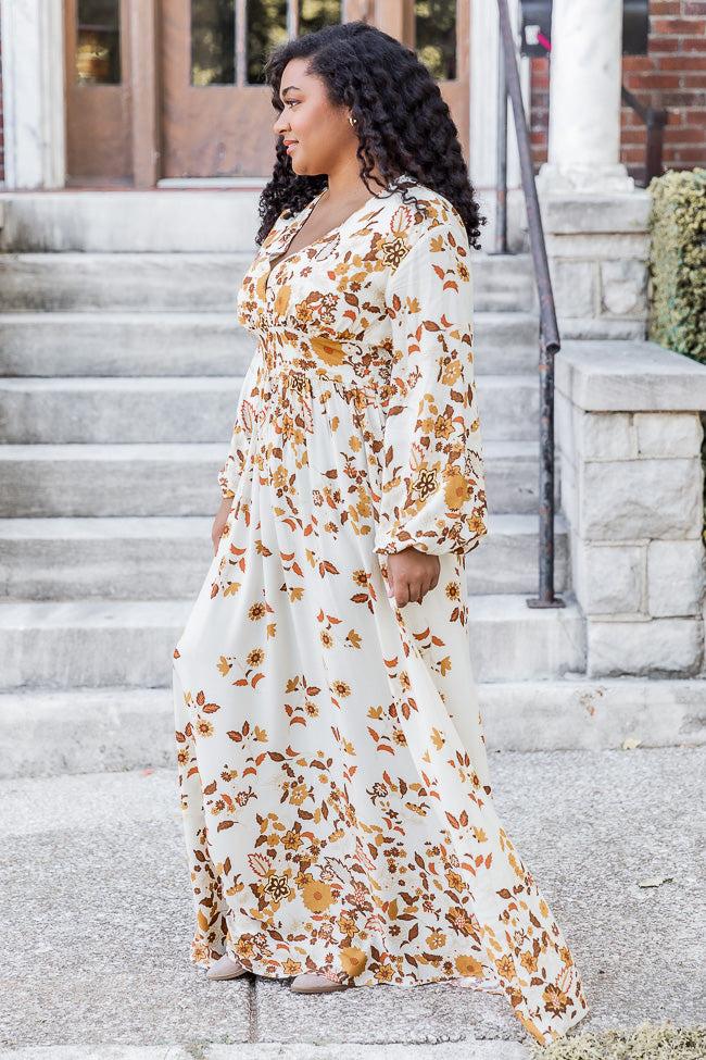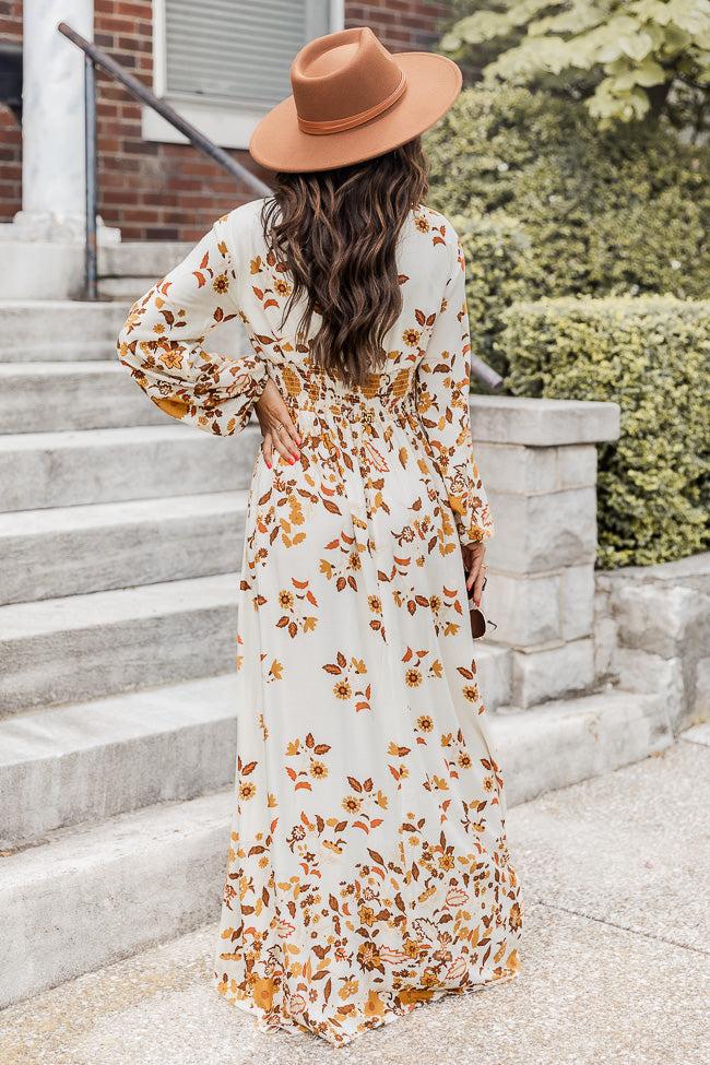 Details Brown leaf print maxi dress Fabric has no stretch, flowy fit V-neckline with long balloon style sleeves and maxi length Pair this cute dress with heels and statement earring Lined Size small from shoulder to hem: 57" Material and Care 100% rayon Hand wash, dry flat Patterns may vary Materials may have natural variations Colors may vary from different viewing devices.