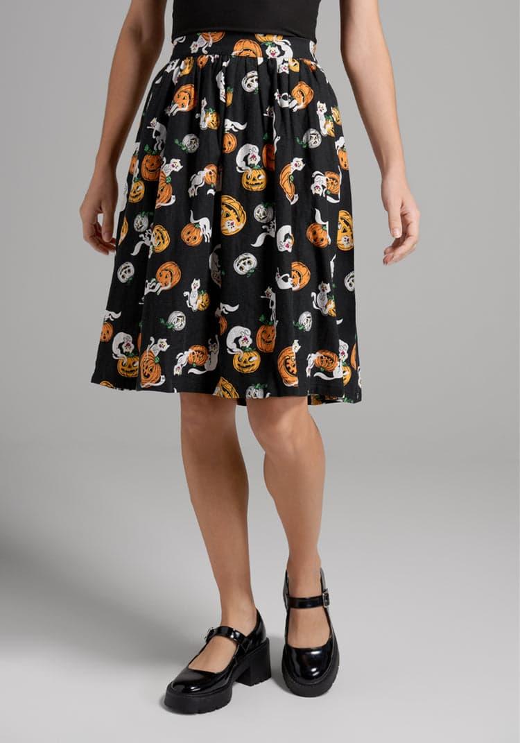 Our best-selling swing skirt is given a spooky upgrade with an exclusive, hand-drawn print of a patch of orange Jack-o-lanterns that are being haunted by the ghosts of curious cats! A durable, fully-lined cotton bottom from our ModCloth namesake label, this black A-line skirt features nifty hidden pockets, an elasticized panel at the back for ease-of-fit, and retro-chic below-the-knee finish that is so much fun to style. Cotton.Machine wash.Fabric does not provide stretch.Elasticized panel at waist.Side pockets.Fully lined.Back zipper with hook and eye closure.Imported Model Measurements: HEIGHT 5'9" / 175 cmBUST 32" / 81 cmWAIST 25" / 64 cmHIPS 34.5" / 88 cmDRESS 2 US / 32 EU / 4 UK