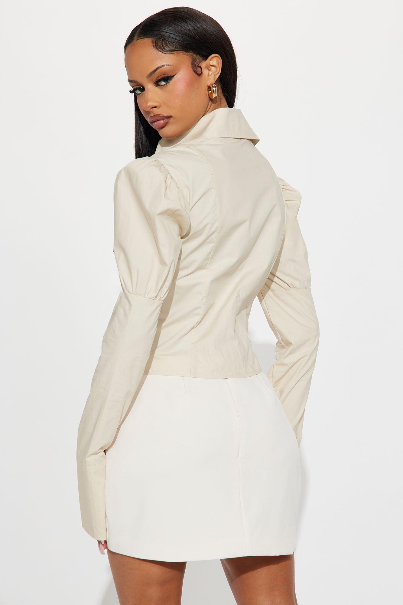 Available In Khaki And White. Poplin Shirt Button Up Lace Up Puff Sleeves Shell: 100% Cotton Contrast fabric: 100% Polyester Imported