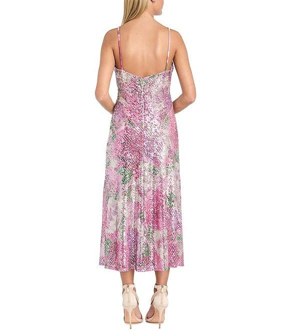 From Morgan & Co., this dress features:Floral printed sequin fabricationV-necklineSleevelessSpaghetti strapsBack zipperApprox. 43" lengthPolyester/spandex; linedSpot clean or hand washImported.