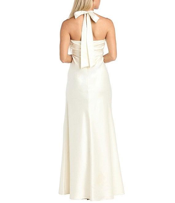 From Morgan & Co., this dress features: Satin fabrication Halter neckline that ties in back Sleeveless Front cutout detail Long skirt Zippered back 62" length Polyester/spandex satin; lined Machine wash/line dry Imported.