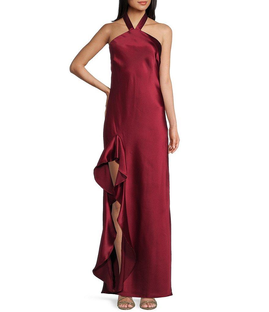 From Morgan & Co. this dress features: Satin fabrication Y halter neckline Tie neck closure Leg slit with ruffle detail Lining Approx. 60" length Polyester/spandex Machine wash/line dry Imported.