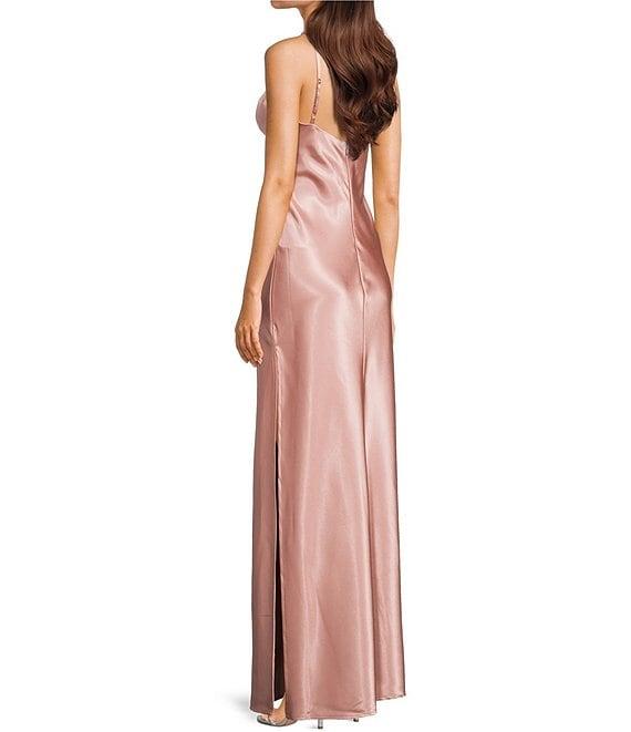 From Morgan & Co., this dress features: Satin Spaghetti strap V-neck Sleeveless Spaghetti strap Rhinestone trim Zipper back closure Lined Approx.61" Polyester/spandex Hand wash/lay flat to dry Made in the USA