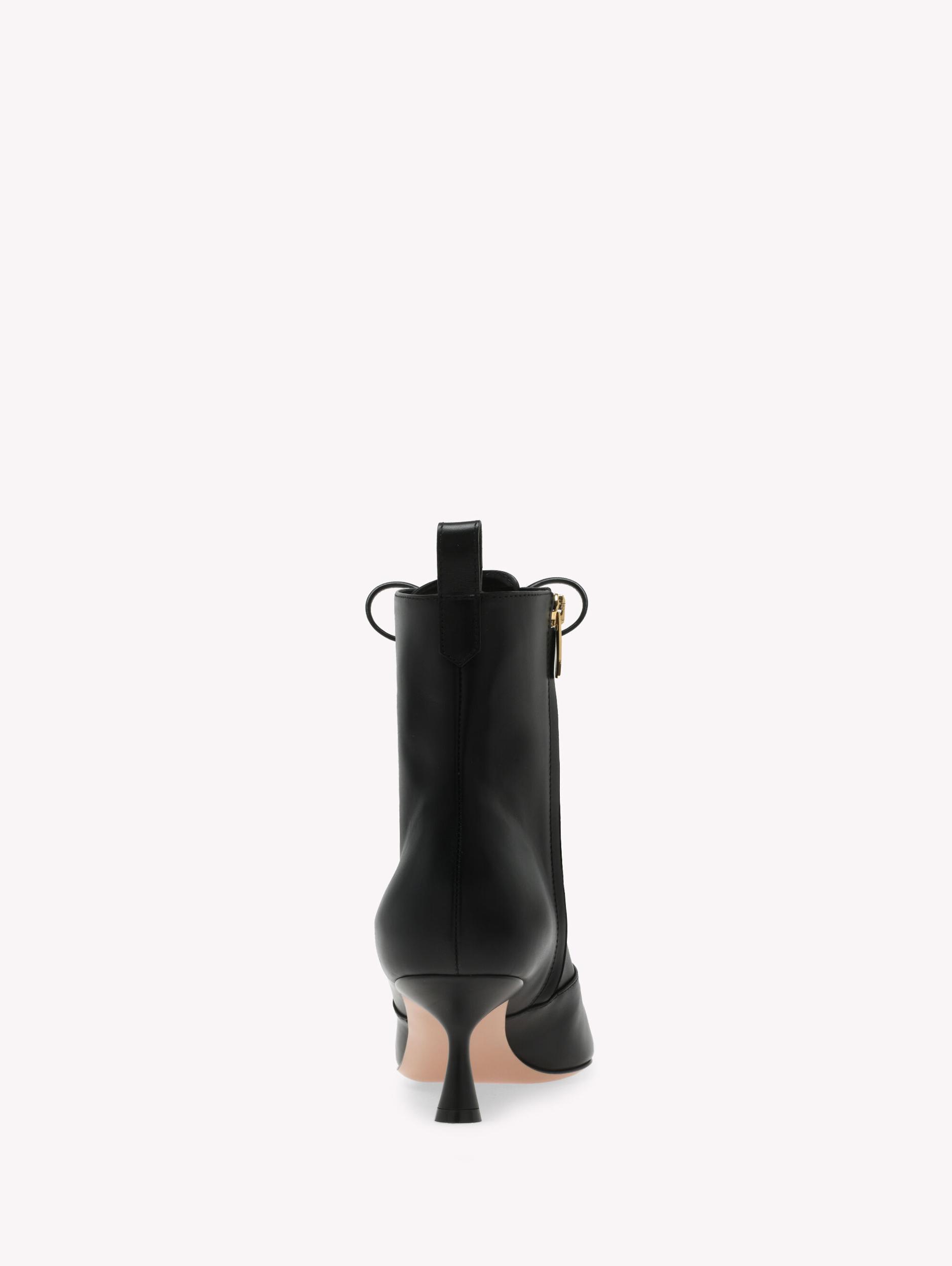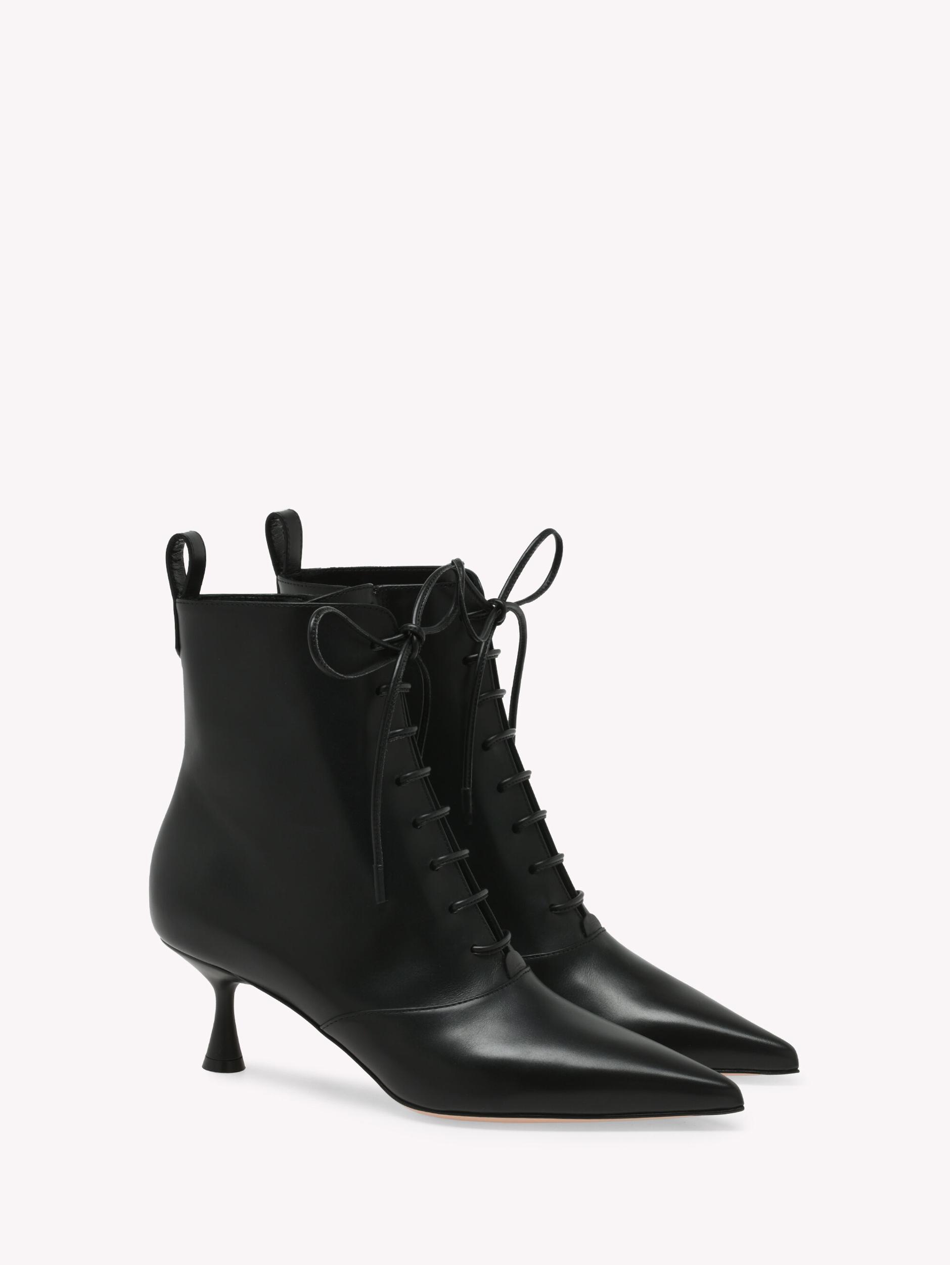 Crafted from leather, Morganne 55 is a pointed-toe lace-up fitted bootie with a tonal lacquered 55mm flare kitten heel. The upper is completed with an inner tonal nylon zipper. Handmade in Italy.