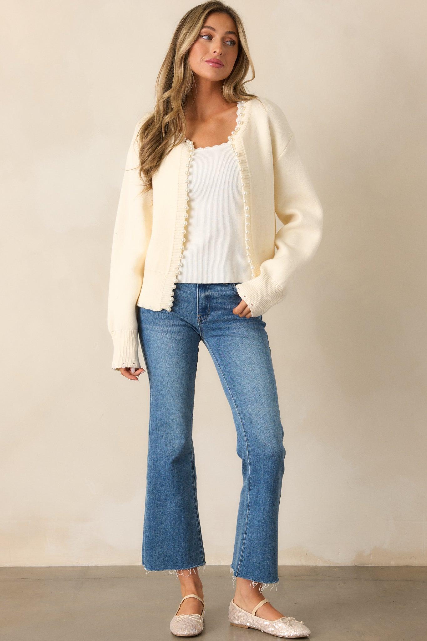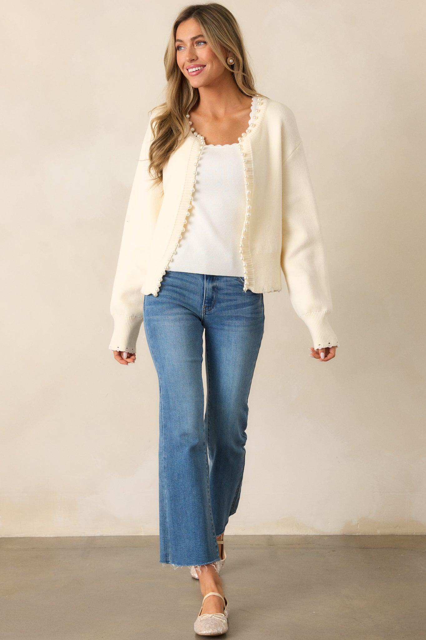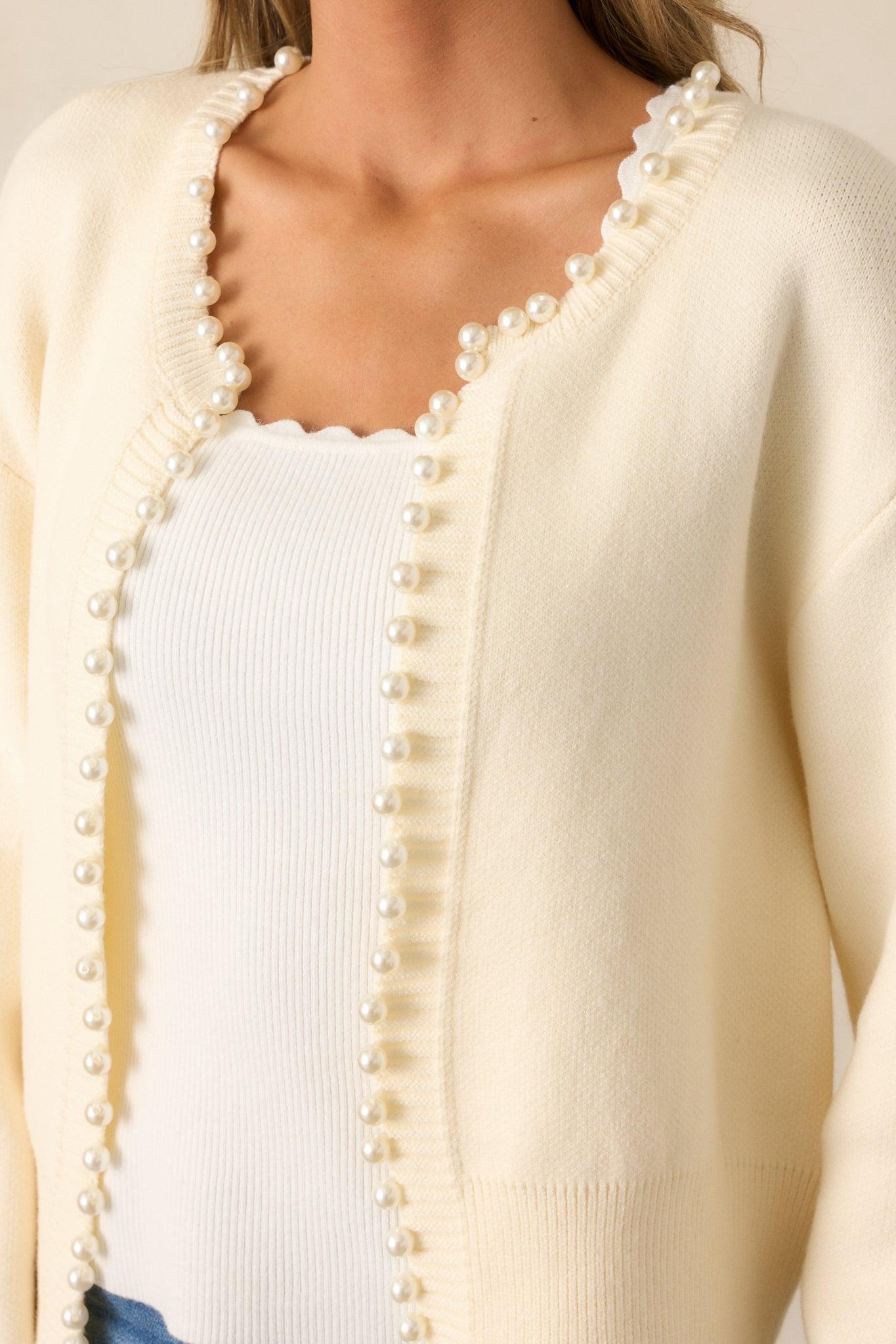 Wrap yourself in luxurious comfort with our Morning Breeze Ivory Pearl Trim Cardigan. Made with soft, lightweight fabric, this cardigan features delicate pearl detailing for an elegant touch. Perfect for layering or wearing on its own, this cardigan will keep you cozy and stylish all day long. This ivory cardigan features a rounded neckline, faux ivory pearl rim, no button closure, and long sleeves with rib knit cuffs.