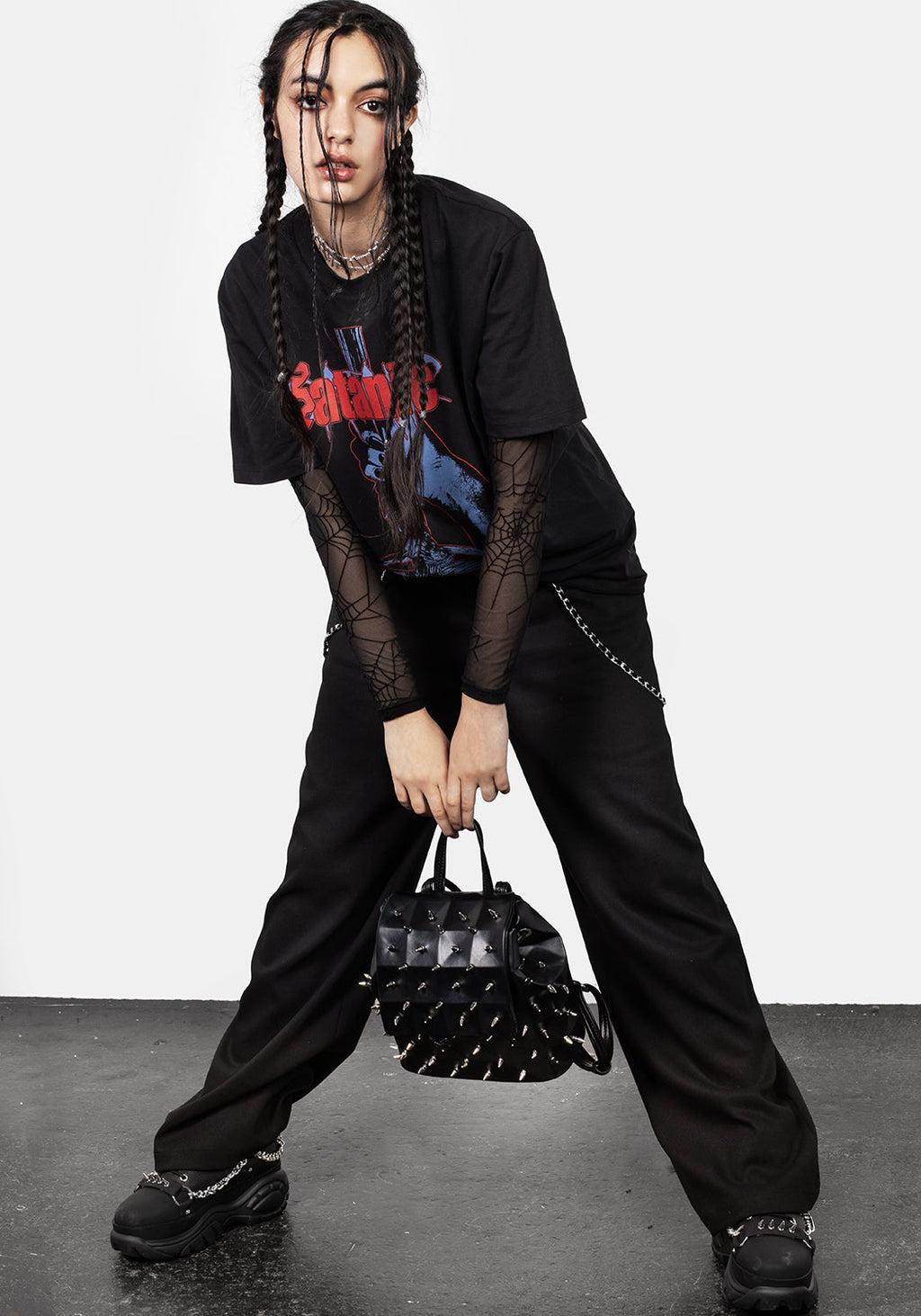 Life is fleeting, buy a bag to fill with cool sh*t- Black studded mini backpack - Miniature size holds essentials for easy access - Self-fabric straps adjust with silver sliders - Drawstring opening covered by front flap, fastened with a magnetic closure - Smooth black faux leather forms geometric shapes - Studded with silver spikes throughout (unsnatchable) - Protective cotton lining with internal zipped pocket & debossed PU branded patch - Worried about your impending mortality? It’s nothing a little retail therapy won’t fix! 100% faux leatherDimensions:Height: 22cmWidth: 27cmDepth: 12cmStrap length: 50cm - 90cm