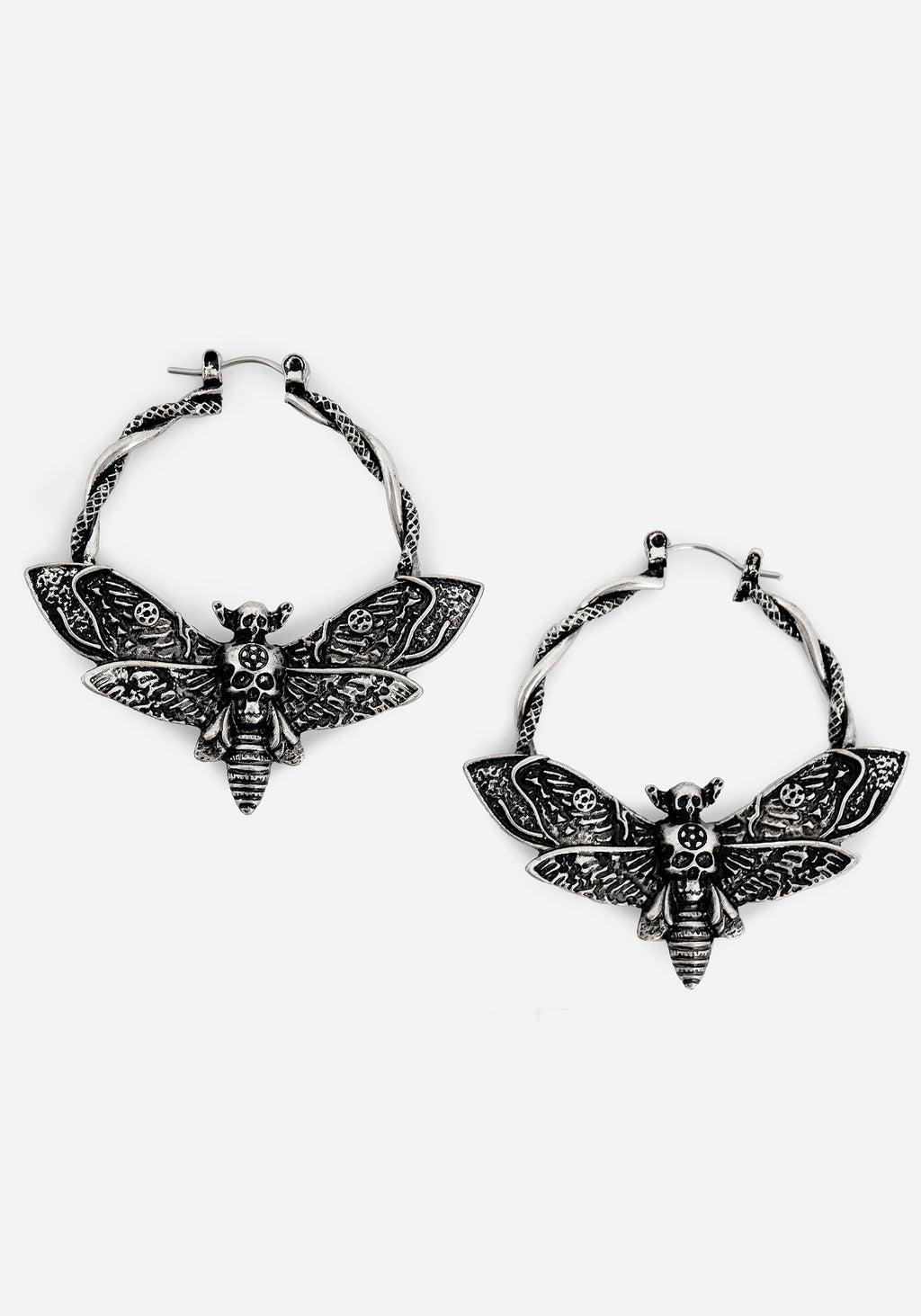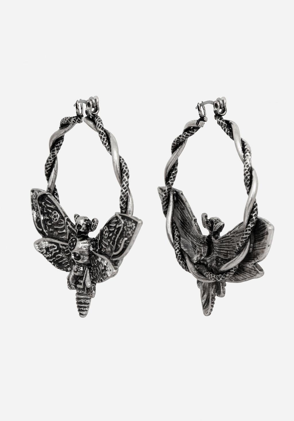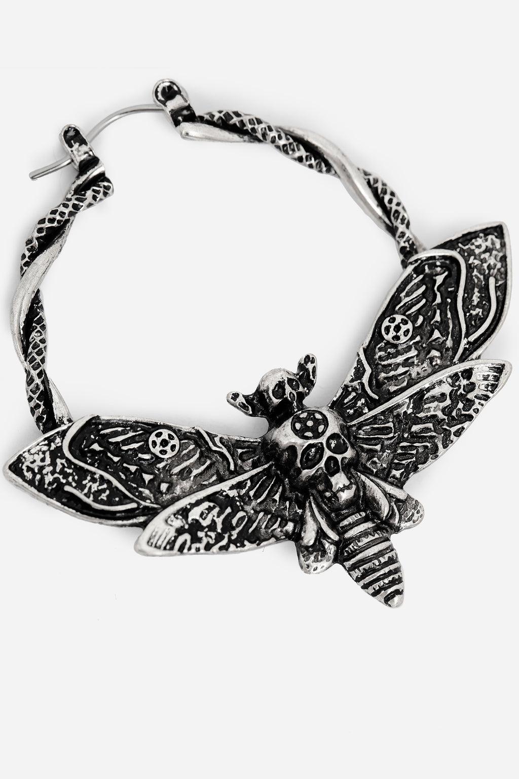 A foreboding symbol & harbinger of death to some, a cute aesthetic bug motif to others. We’re on both sides! The intricately moulded death’s head hawkmoth charm hangs from hoop earrings, attached to silver hoops entwined with a rope-look detail. The antique silver plate finish adds dimension to let its features shine! - COLOUR: Silver - COMPOSITION: Real silver plate - TOTAL DROP: 5cm