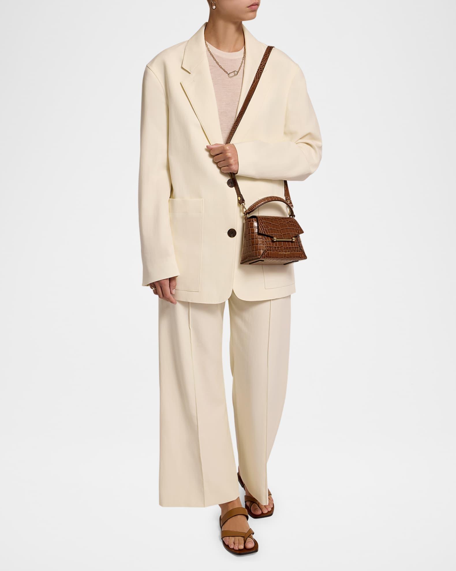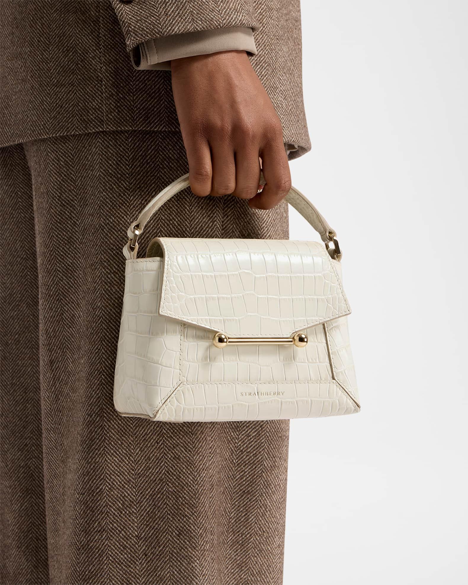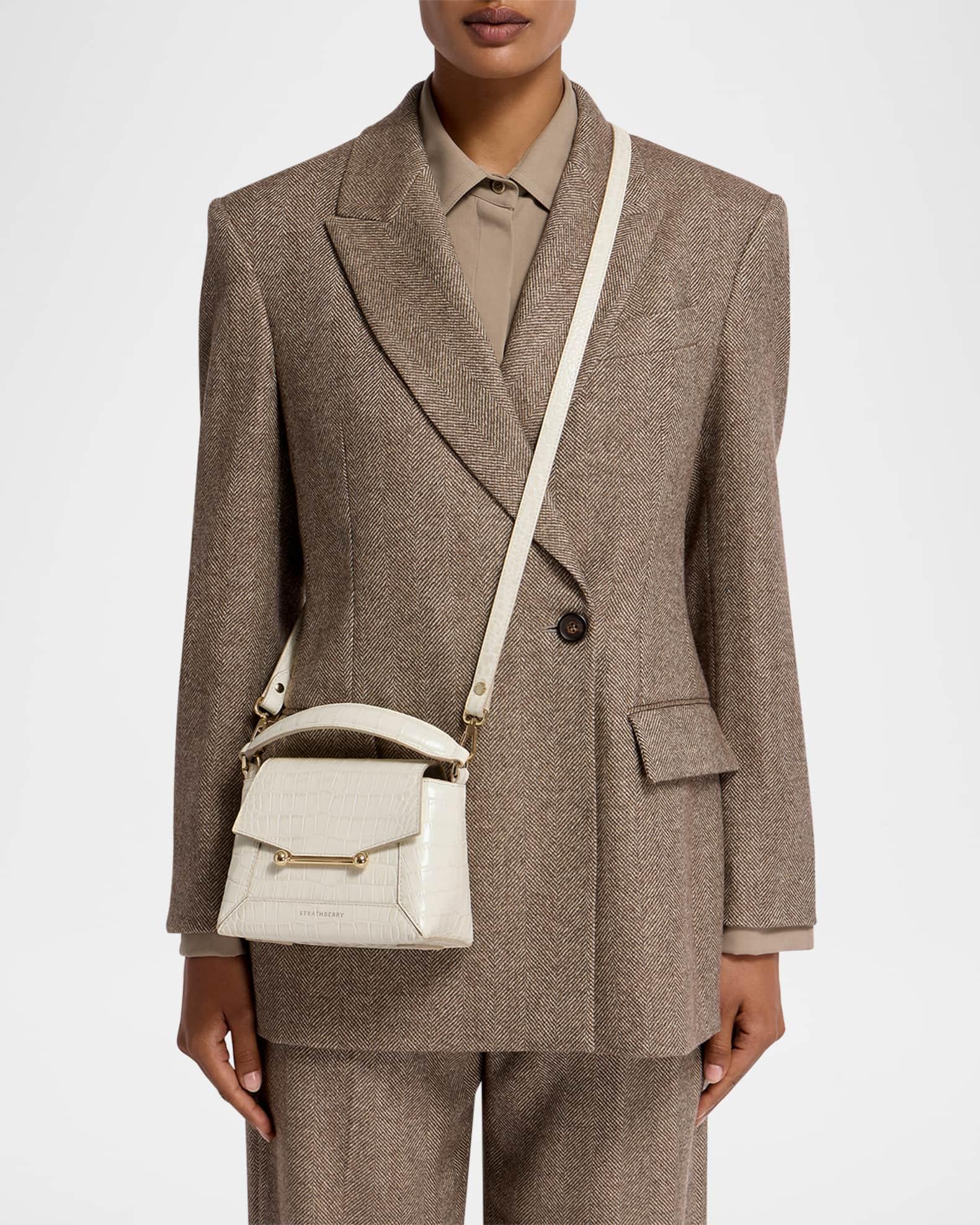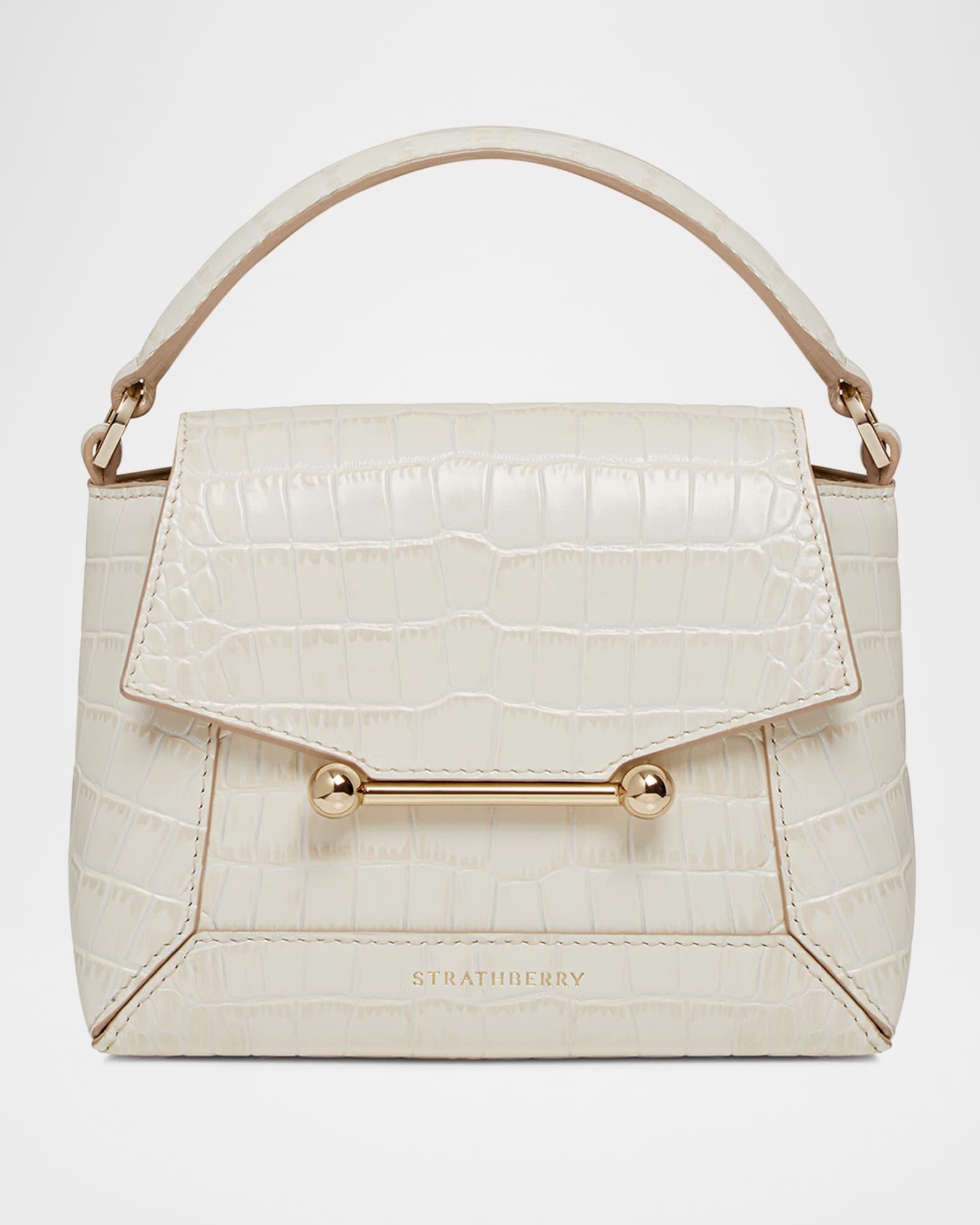 STRATHBERRY "Mosaic Nano" top handle bag in croc-embossed calfskin leather Top handle Detachable, adjustable crossbody strap Can be worn as a top handle or crossbody bag Flap top with magnetic closure; metal bar accent Interior, one slip pocket Lining: Polyester Approx. 5.5"H x 7.1"W x 3.5"D Item Weight (Lbs.): 0.9 Made in Spain