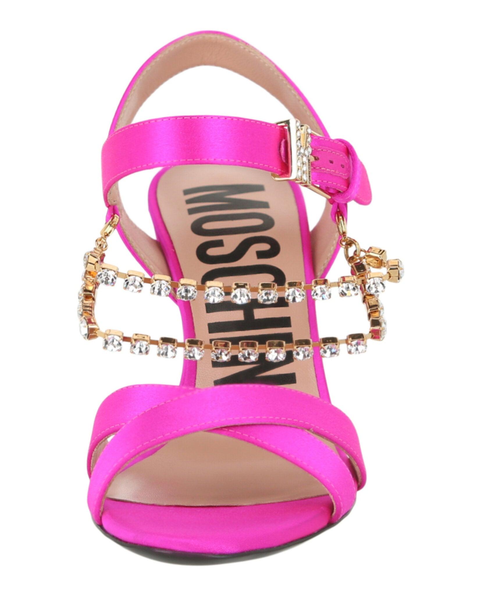 Fulfilled by our friends at Carro Luxury MaisonDETAILS Heel Height: 3.5" Buckle ankle closure with logo buckle fastening Rhinestone embellishment Almond toe Stiletto heel Branded leather insole; Gold-tone hardware Specialist clean only Upper: 72% Viscose, 28% Silk; Lower: 100% Leather Made in Italy