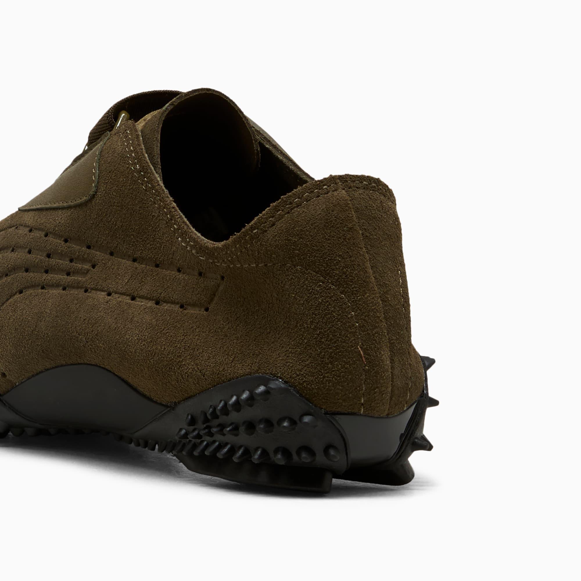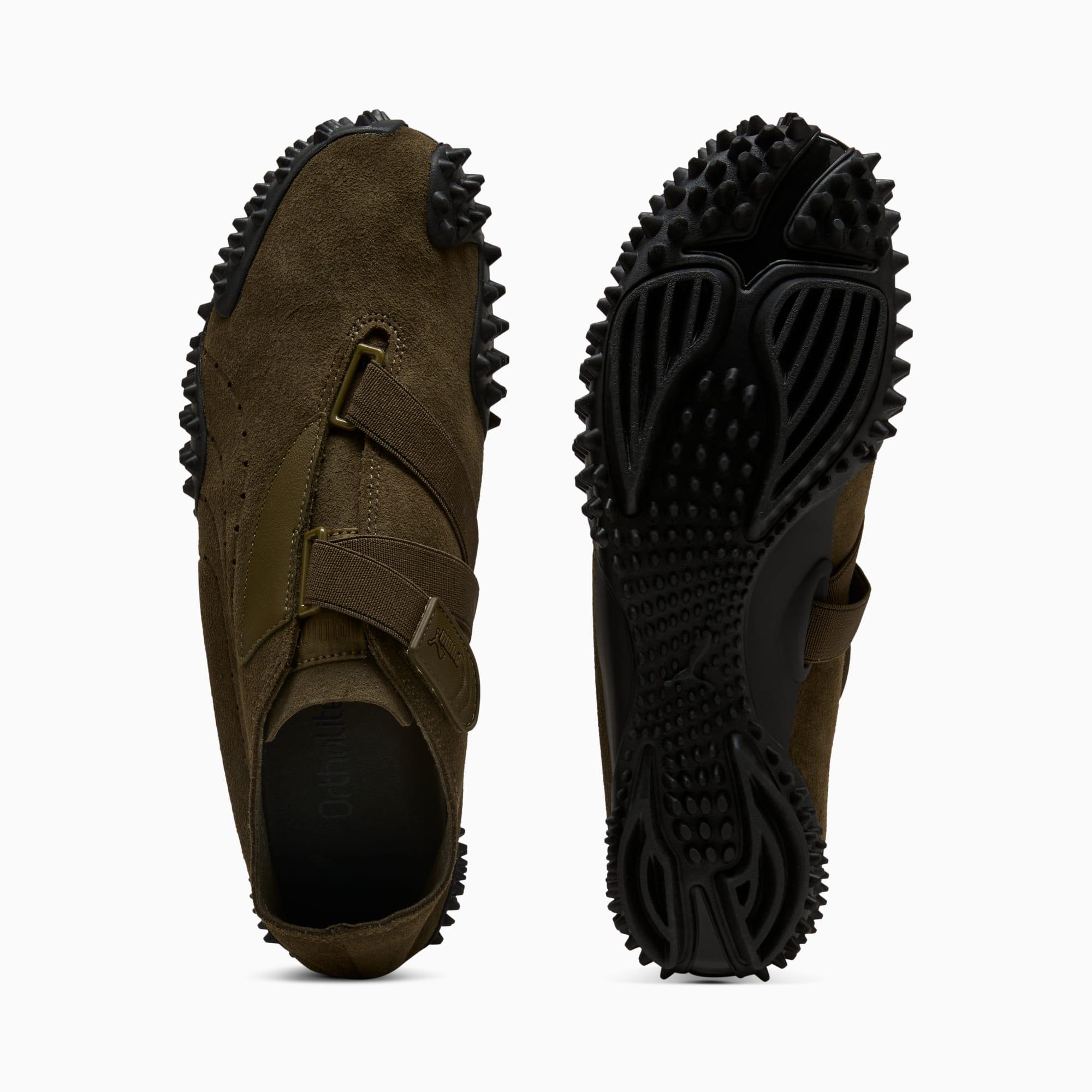 descriptionMostro isn't a shoe for just anyone. For over two decades, it's been worn by those who defy conventions and reject the norm. Taking its name from the Italian word for monster, Mostro is a hybrid creation that draws inspiration from two diverse realms: the sleek sprinting spikes of the '60s and the surfing shoes of the '80s. To this day, it continues to captivate with its distinctive, sculptural design, low-profile shape, and avant-garde, spiked sole. This version is crafted in suede with no lining, offering extra lightness and flexibility.Style: 403174_04Color: Deep Olive-PUMA BlackdetailsFit: RegularToe Type: RoundedFastener: Elasticated hook-and-loop closure systemLining: UnlinedOrthoLite® socklinerOutsole: RubberRubber spikes on the sole as design detailmaterials & careMaterial informationSockliner: 100% SyntheticOutsole: 83.70% Rubber, 16.30% SyntheticUpper: 86.49% Leather - cow, 10.17% Textile, 3.34% SyntheticLining: 100% Synthetic