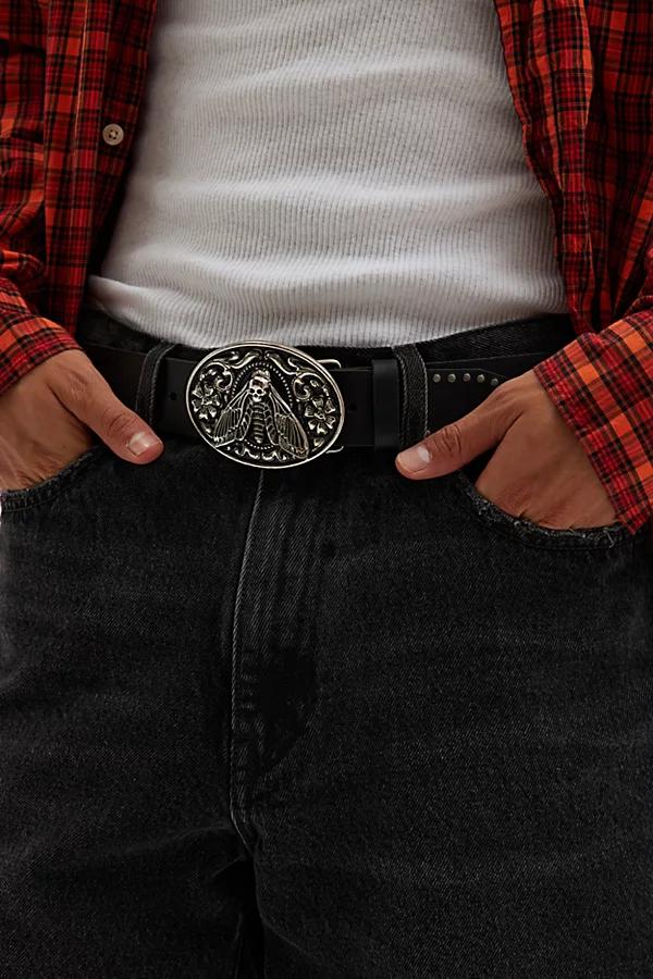 Leather belt with stud accents and featuring a moth motif buckle closure. Features Moth buckle belt Leather belt Adjustable fit Moth buckle Content + Care 100% Leather Spot clean Imported Size Small: 38 Medium: 40 Large: 42 X-Large: 44 Moth Buckle Belt in Black, Mens at Urban Outfitters