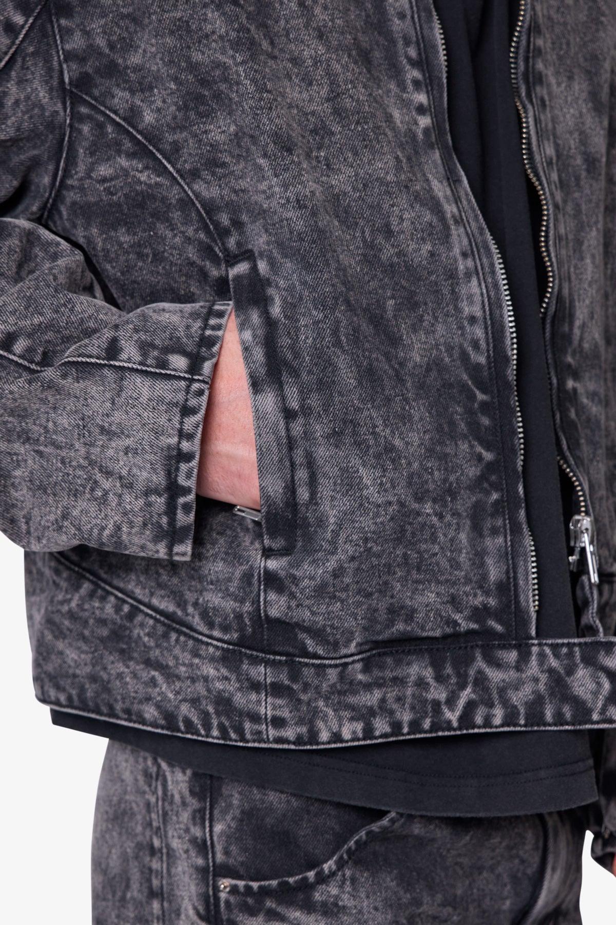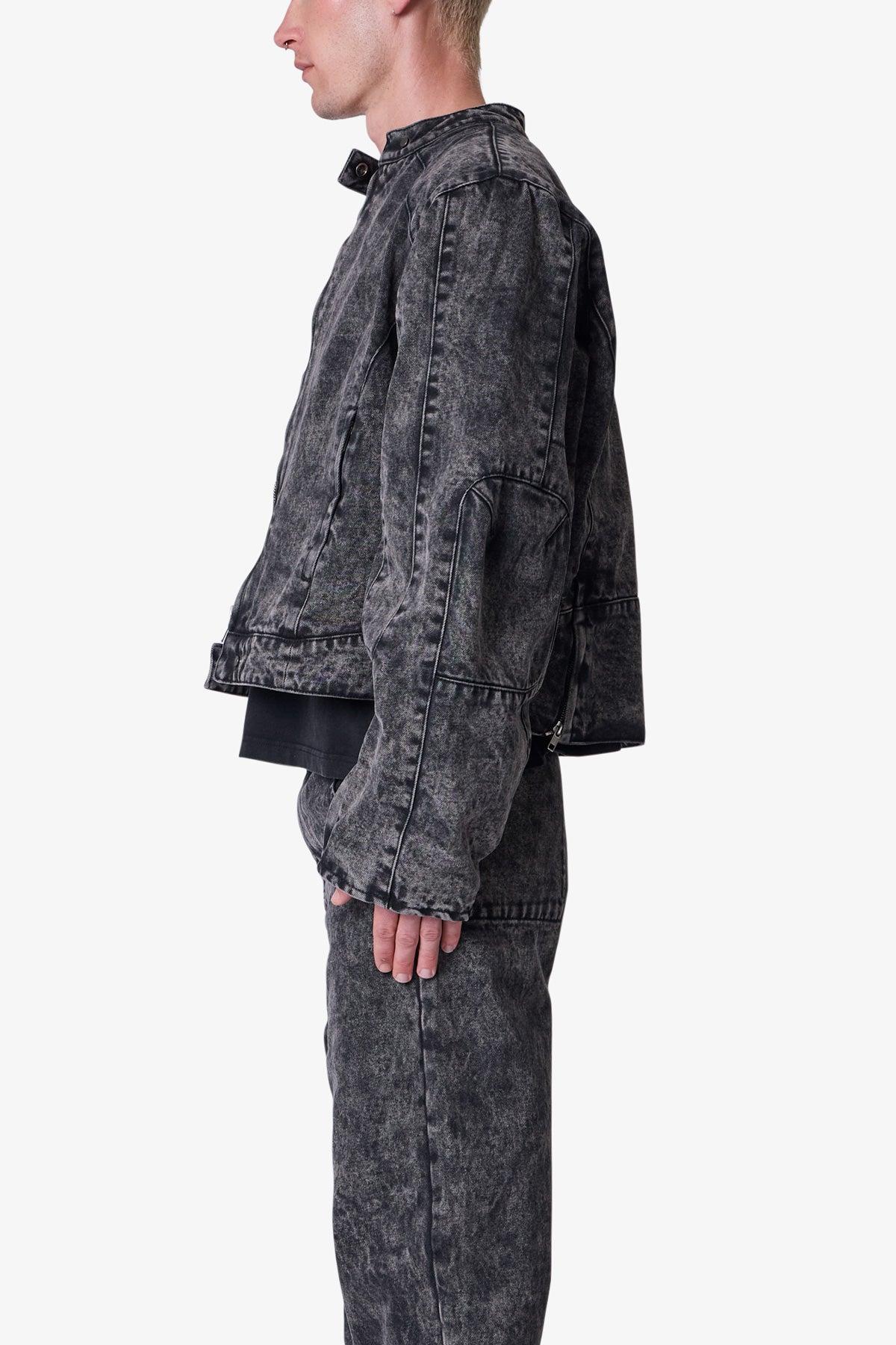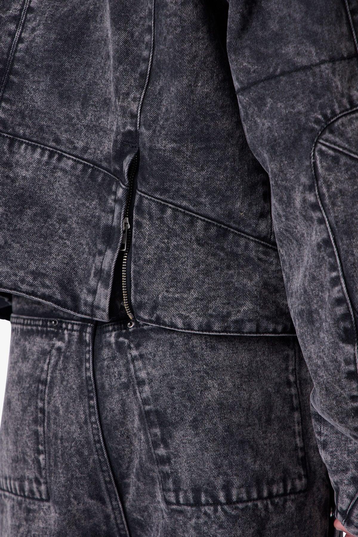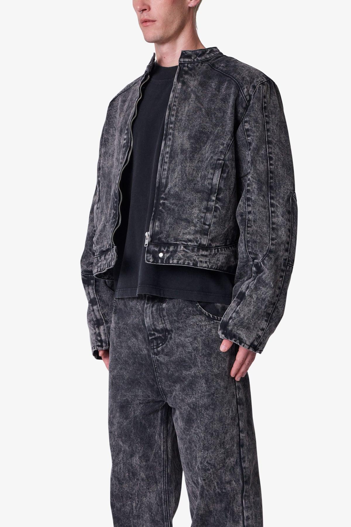 Constructed from 13 oz stone-washed blue denim, the Moto Denim Jacket features a cropped, slightly boxy silhouette. Designed with a minimal stand collar secured by a snap button, vertical zippered front pockets, and multiple panel seams throughout for a utilitarian structure. Finished with a full-length center front zi