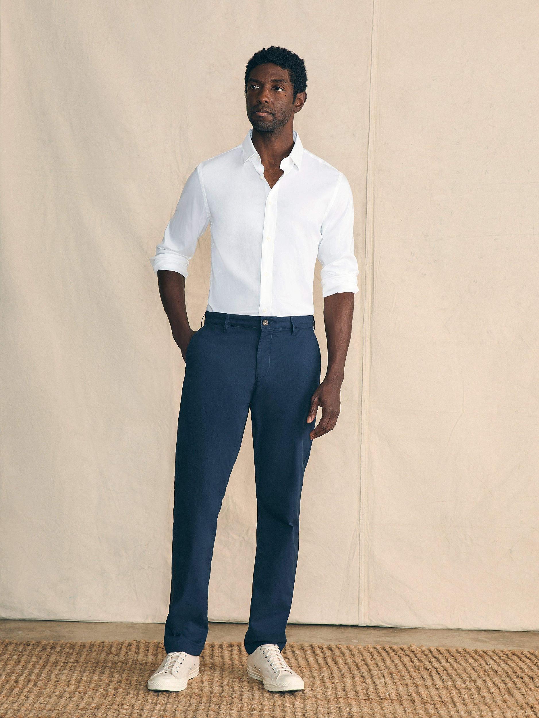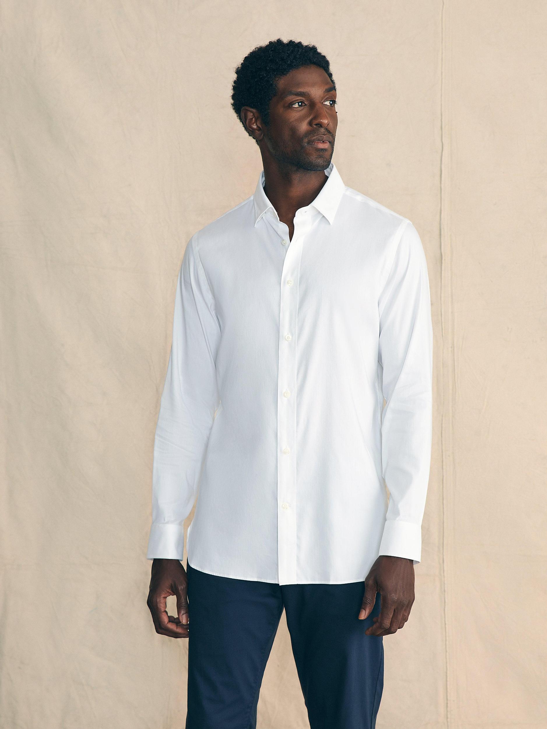 Incredibly soft and airy, the magic of this button-up shirt first comes from our custom-developed Supima cotton blend. What makes Supima cotton so special? Its extra-long staple fiber is renowned for producing the smoothest and finest yarn with natural performance qualities. Then we added the perfect amount of stretch — so it’s comfortable all day. Wrinkle-resistant, with clean, refined tailoring, it has a spread collar with more room for a tie and a longer length, meaning it's made to be tucked in. Meet your new favorite dress shirt – perfect for wearing under a jacket or blazer to any event. It is still the shirt you can always count on. Fit: Relaxed through the chest with a slight taper at the waist. Relaxed, tapered sleeves. Longer than the sport shirt version. Detail: Spread collar with concealed buttons to prevent fly-away. Button front and cuffs. Shirttail hem. Material: 55% Supima® Cotton, 25% Recycled Nylon, 16% Lycocell, 4% Elastane; Troca Faherty Logo Buttons; Faux Shell Buttons Care: Turn inside out. Machine wash cold with like colors. Gentle cycle. Do not bleach. Tumble dry low. Remove promptly. Cool iron when needed. MWS2413-CWI
