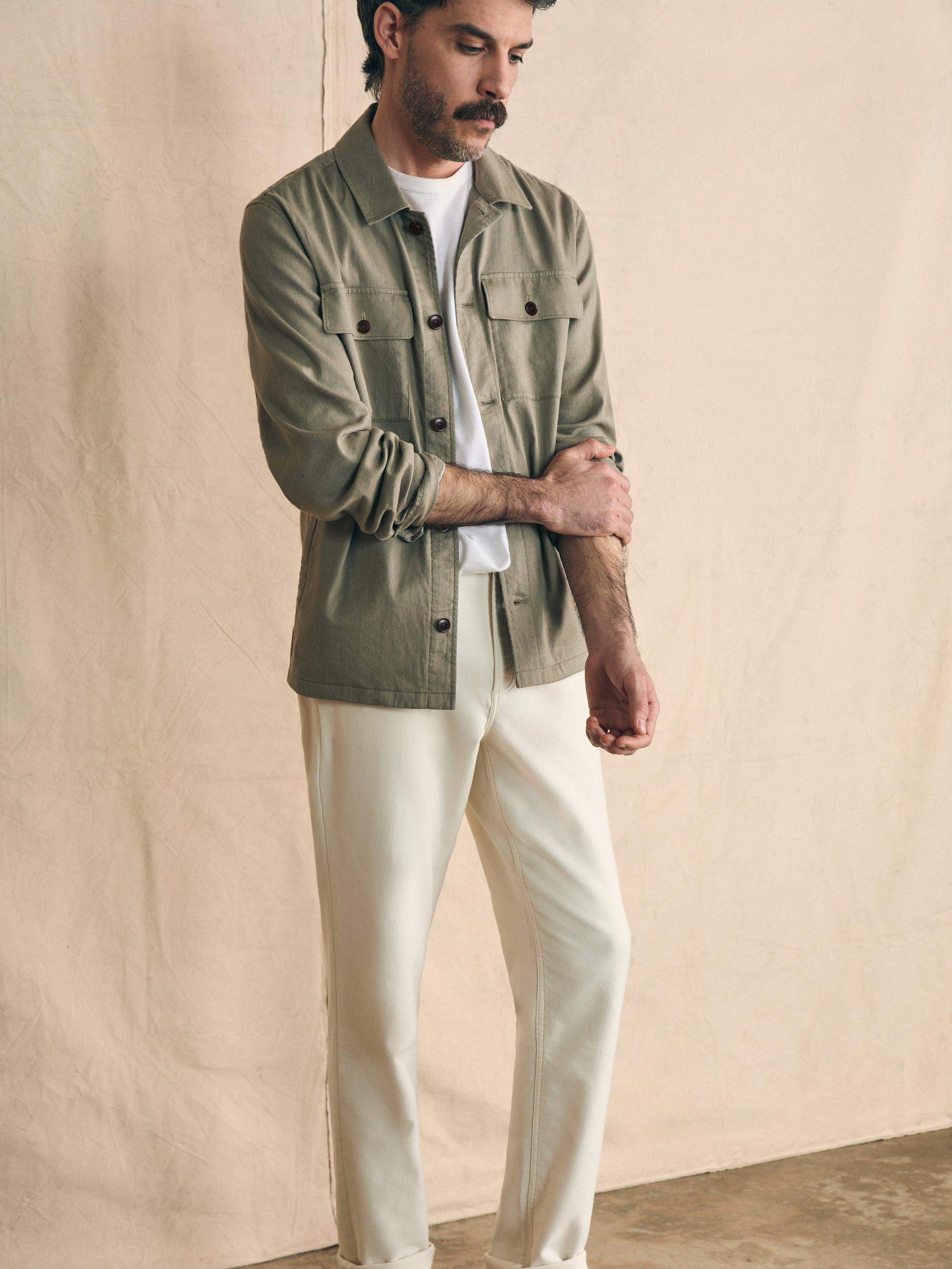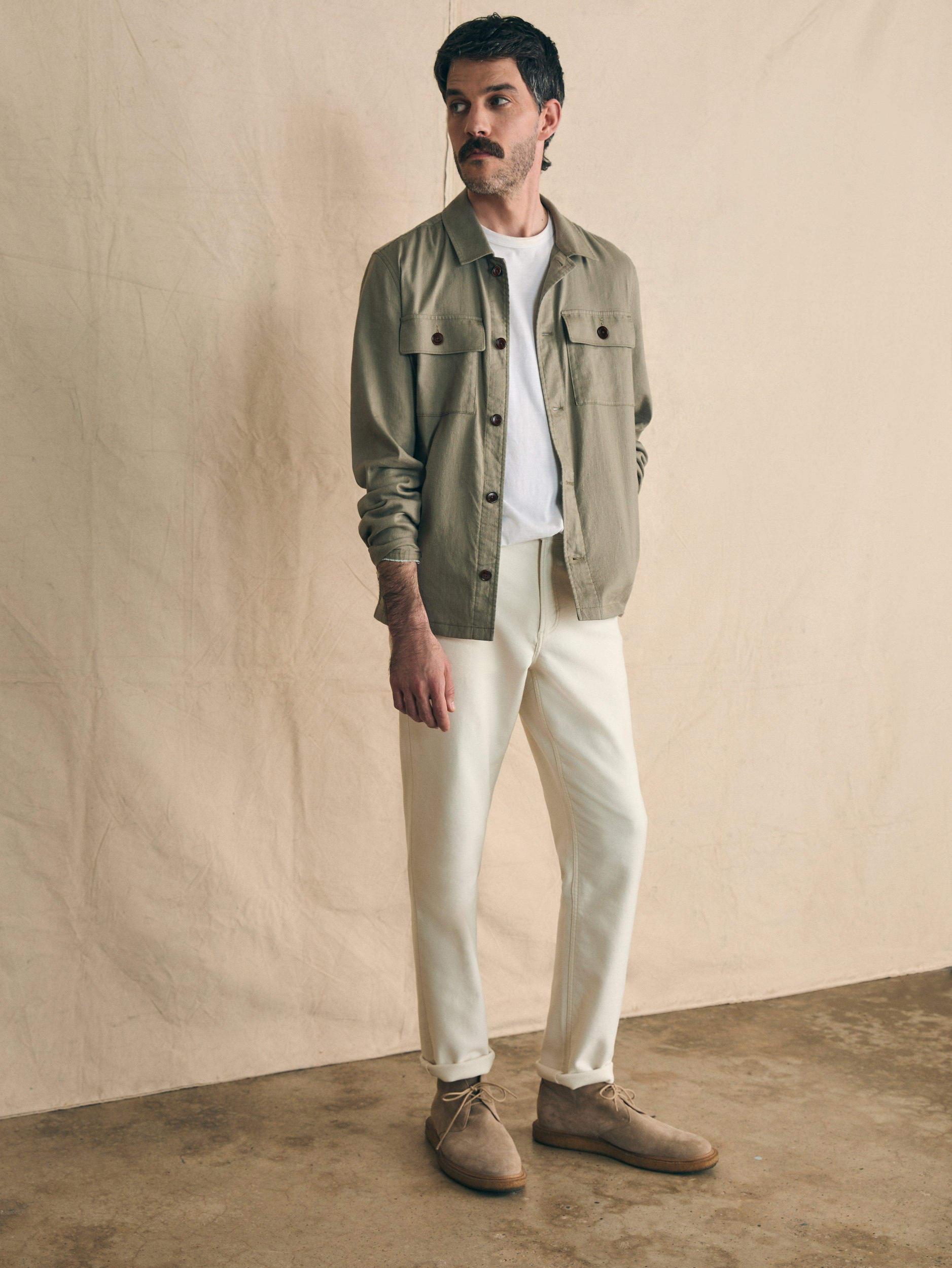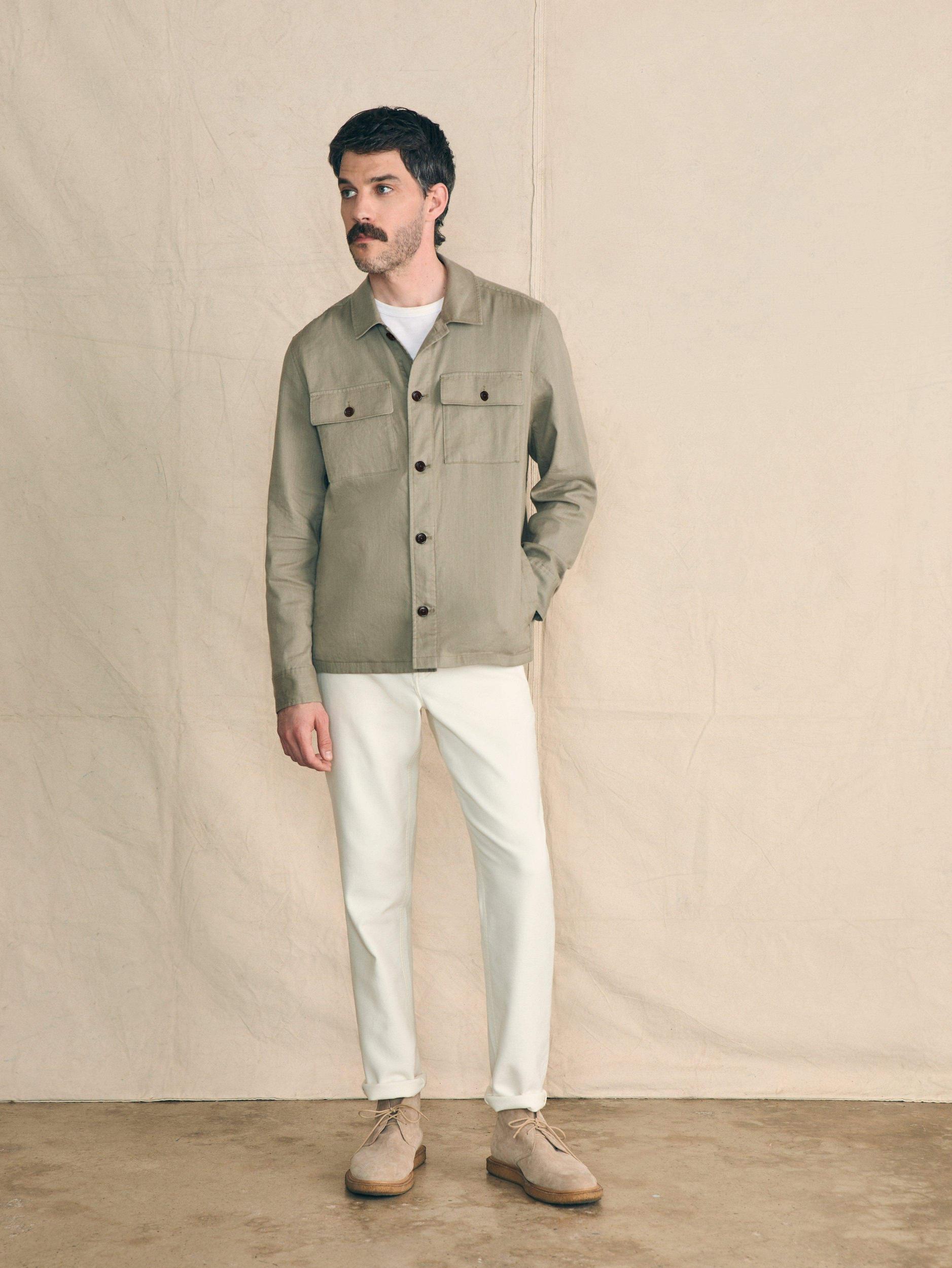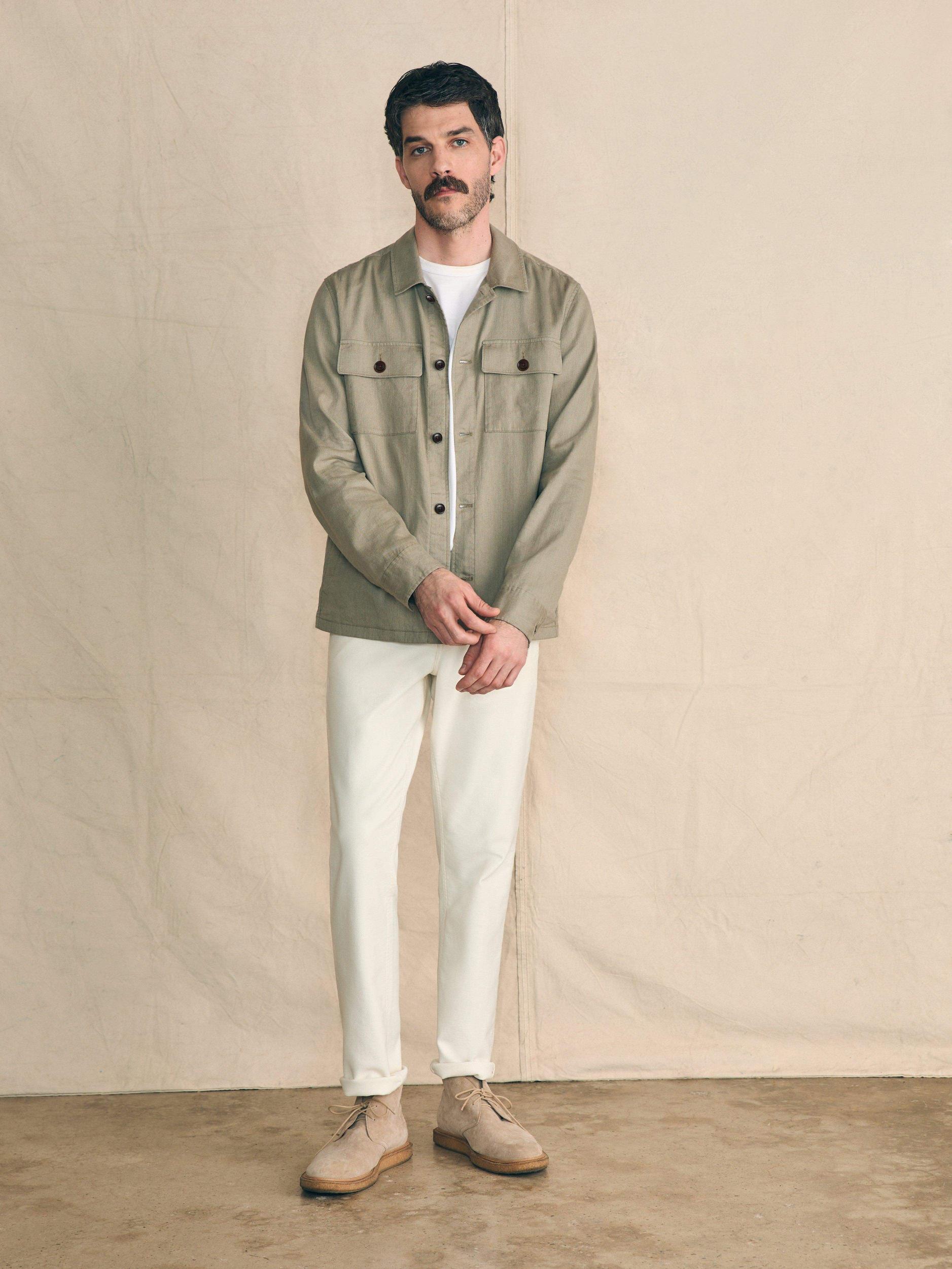 Movement Flex Linen is the latest and greatest fabric for summer. The linen cotton blend has just enough stretch to provide comfort and mobility and it's the perfect weight for wearing on a summer day. This is the effortlessly polished layer to take you through the summer's events. Fit: Relaxed fit at the chest and arms. Straight from chest to bottom opening. Detail: Button front closure. Shirt style collar. Patch pockets at chest with button closure. Lower pockets hidden at side seams. Adjustable button cuffs. Locker loop at interior back neck seam. Material: 55% Linen, 43% Organic Cotton, 2% Elastane; Horn Buttons Model: Cale is 6'1 wearing size Medium Care: Close all fastening before wash. Turn inside out. Machine wash cold with like colors. Delicate cycle. Do not bleach. Tumble dry low. Remove promptly. Cool iron when needed. MOU2403-OIS