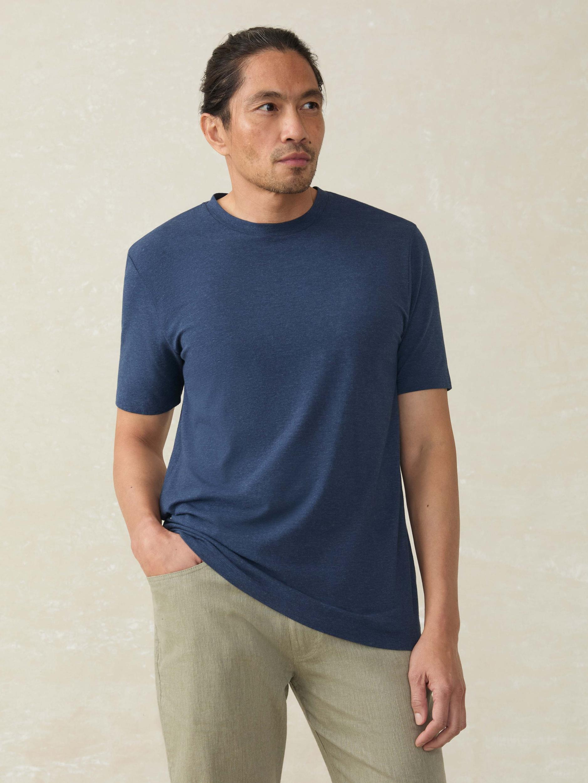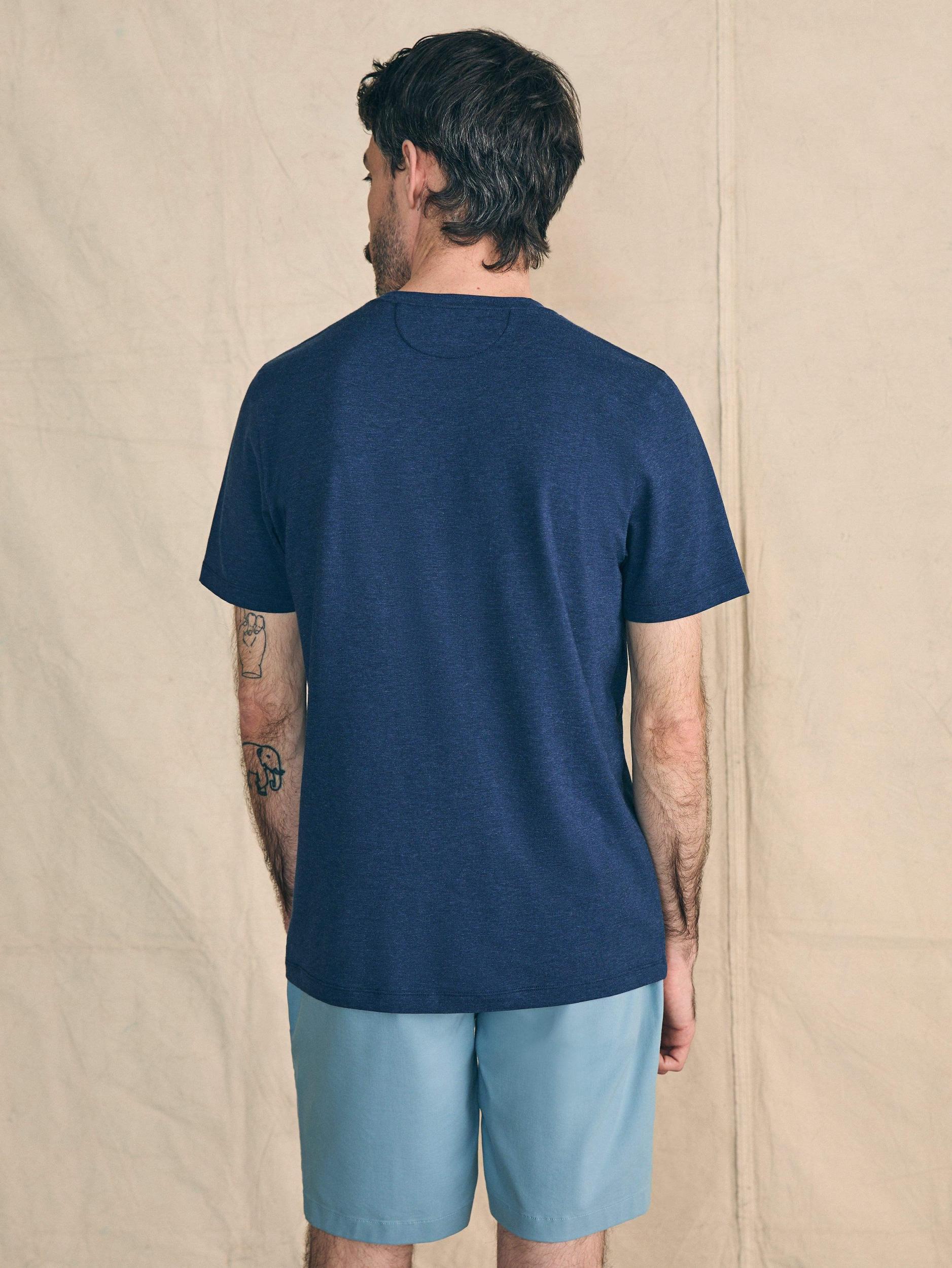 Made with a ridiculously soft fabric with incredible stretch, this performance-driven t-shirt moves with you through every scenario. With subtle highs and lows, the heathered color makes it the ultimate laidback essential. Fit: Tailored fit, with a slight taper at the waist. Detail: Self fabric set-in collar. Bungee locker loop sewn into interior neck seam. Sun & Waves label at wearer's left hem. Material: 37% Nylon, 34% Pima Cotton, 22% Modal, 7% Elastane Model: Cale is 6'1 wearing size Medium Care: Turn inside out. Machine wash cold with like colors. Gentle cycle. Do not bleach. Tumble dry low. Remove promptly. Cool iron when needed. MKU2417-GFH