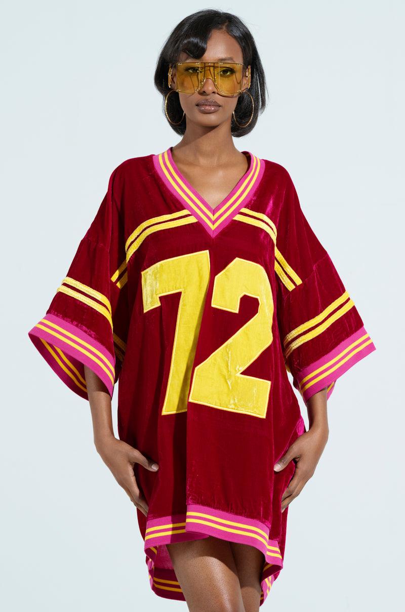 Score a fashion touchdown in The AKIRA Label Moving Forward Velvet Jersey Dress. This sporty-chic piece is crafted from rich, wine-red velvet and features a relaxed, oversized fit, short sleeves, a ribbed knit V-neckline, hemline, and sleeve cuffs, varsity-inspired accent stripes, and a giant, embroidered “72” on the front and back. - 100% Polyester - Hand Wash or Dry Clean- No Stretch- Imported (all measurements approximate from size small)- 34” Shoulder to Hem- 25” Shoulder to Shoulder- 9” Sleeves- Model is 5’8” and wearing a size smallProduct ID: 469880 (all measurements approximate from size 1X)- 37” Shoulder to Hem- 27” Shoulder to Shoulder- 11” SleevesProduct ID: 469884