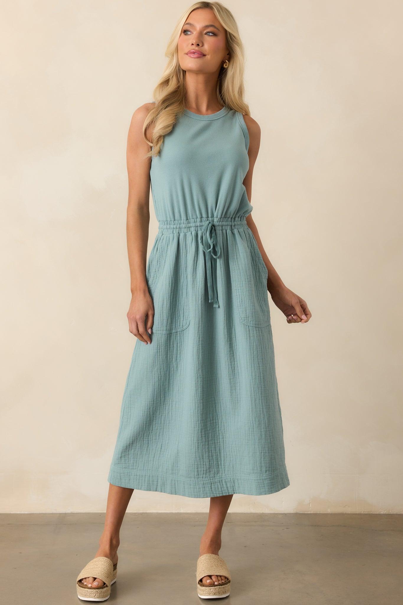 The Moving Slowly Sage Cotton Gauze Sleeveless Midi Dress is a go-to for laid-back days. Its easygoing style lets you stay comfortable while still looking put-together, making it perfect for casual outings or a day of relaxation. This sage midi dress features a round neckline, sleeveless design, ribbed bodice, elastic waistband, adjustable self-tie drawstring waist, gauze textured skirt, and functional patch pockets. 96% Cotton & 4% Spandex Unlined Hand Wash Cold Manufactured in China Designed in The USA Model is Wearing a Size Small