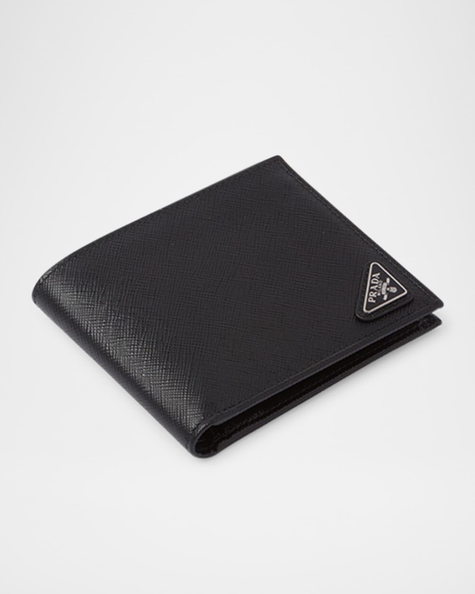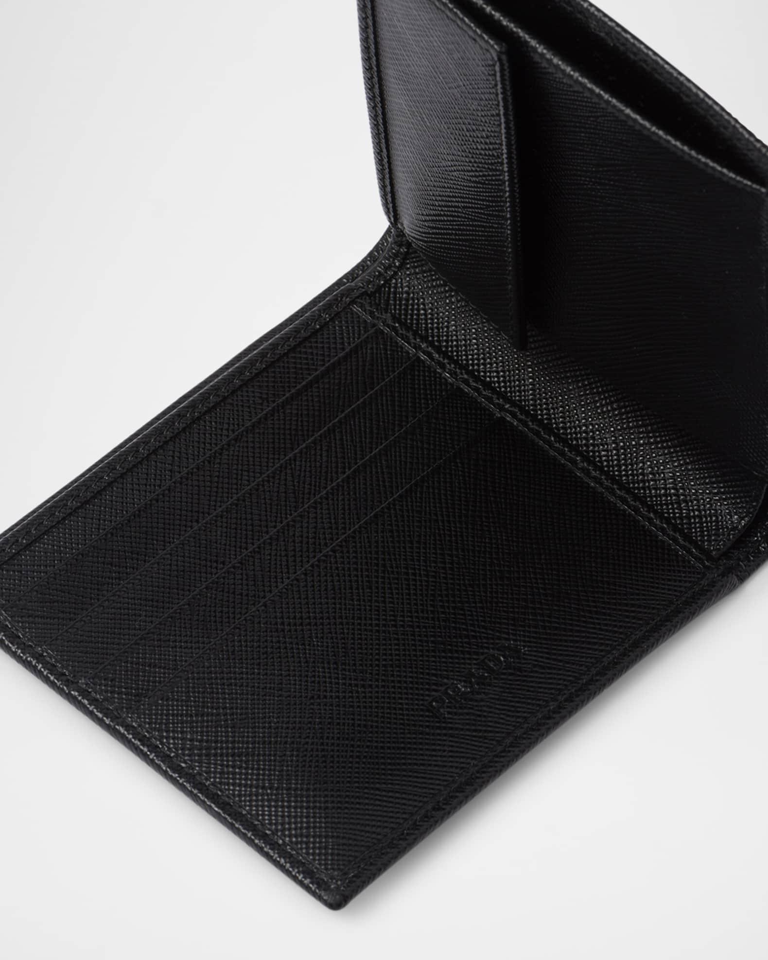 enameled metal triangle logo four card slots two bill compartments internal coin pocket with flap moire and saffiano leather lining 9.5cm x11.0cm x0.0cm Imported