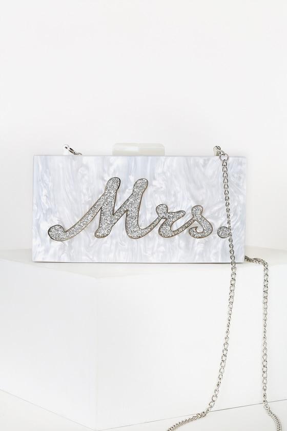 Say "I Do!" in style with the Lulus Mrs. Bridal White and Silver Glitter Acrylic Box Clutch! This cute rectangular box clutch has a sleek, opalescent white, acrylic construction accented by a metallic silver glitter graphic that reads "Mrs." across the front. Open the matching white clasp closure to reveal a structured interior with accordion sides. Carry as a clutch or attach the matching shiny silver chain shoulder strap!