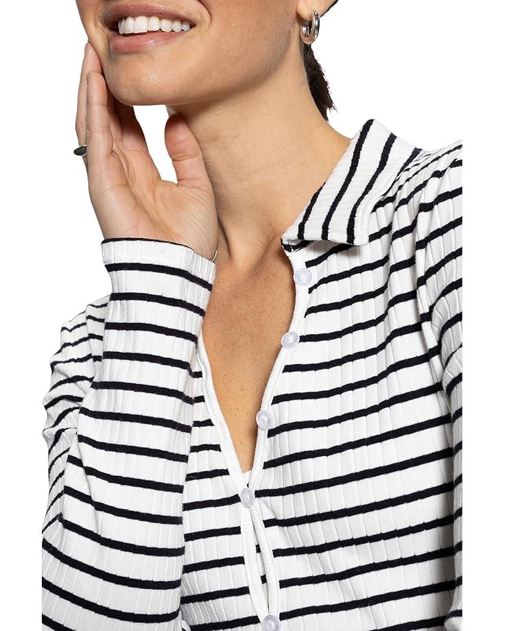 Feel good inside out wearing the stylish Sanctuary™ Daydreamer Knit Shirt. This top features collared neckline, long sleeves, button front closure, allover stripe print, and straight hemline.