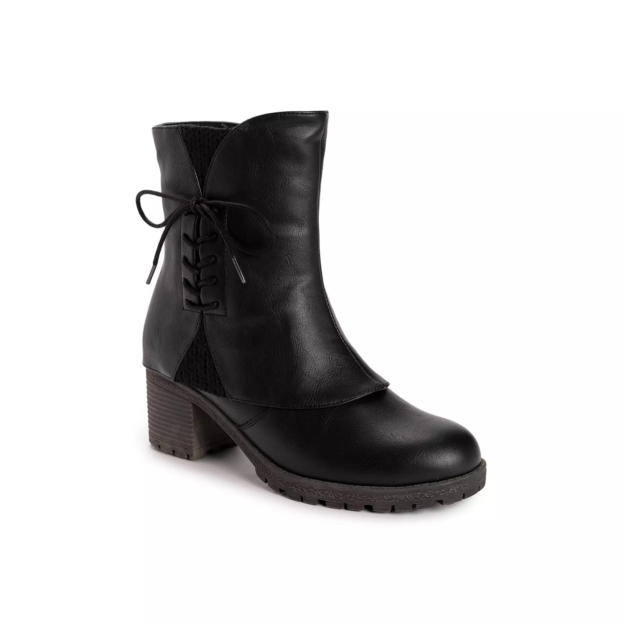 Make every step count with these MUK LUKS Lucy Lillith women's ankle boots. Click this FOOTWEAR GUIDE to find the perfect fit and more! - https://www.kohls.com/feature/shoesizeguide.jsp. FEATURES: Water-resistant, Decorative lace-up design, Memory foam insole, Stacked block heel. DETAILS: Faux leather, acrylic upper, Polyester lining, Thermoplastic Rubber (TPR) outsole, Round toe, Zipper closure, Foam footbed, .59-in. heel, .59-in. platform, 2.86-in. shaft, 12.05-in. circumference, Spot clean, Imported. Color: Black. Gender: female. Age Group: adult.