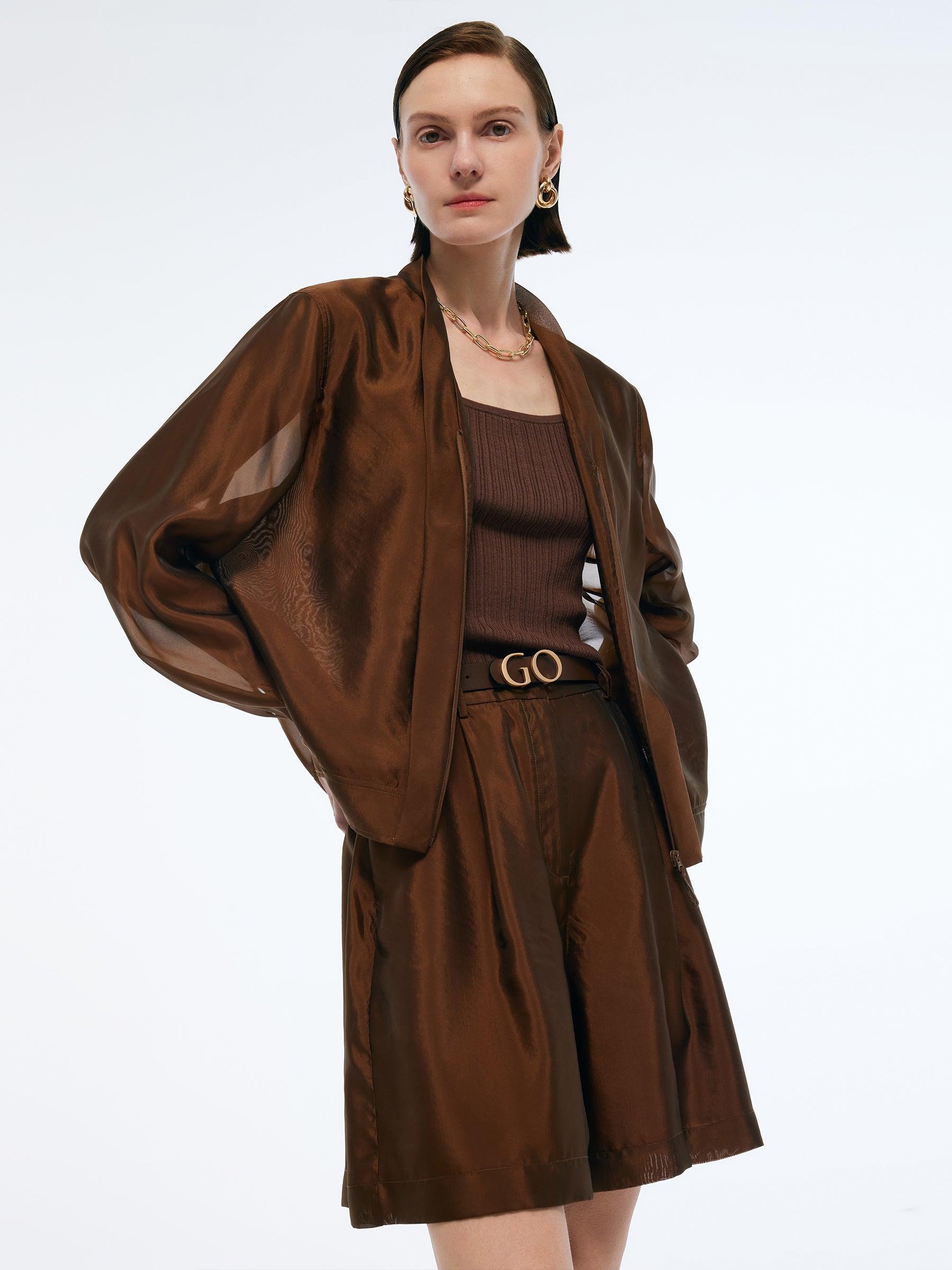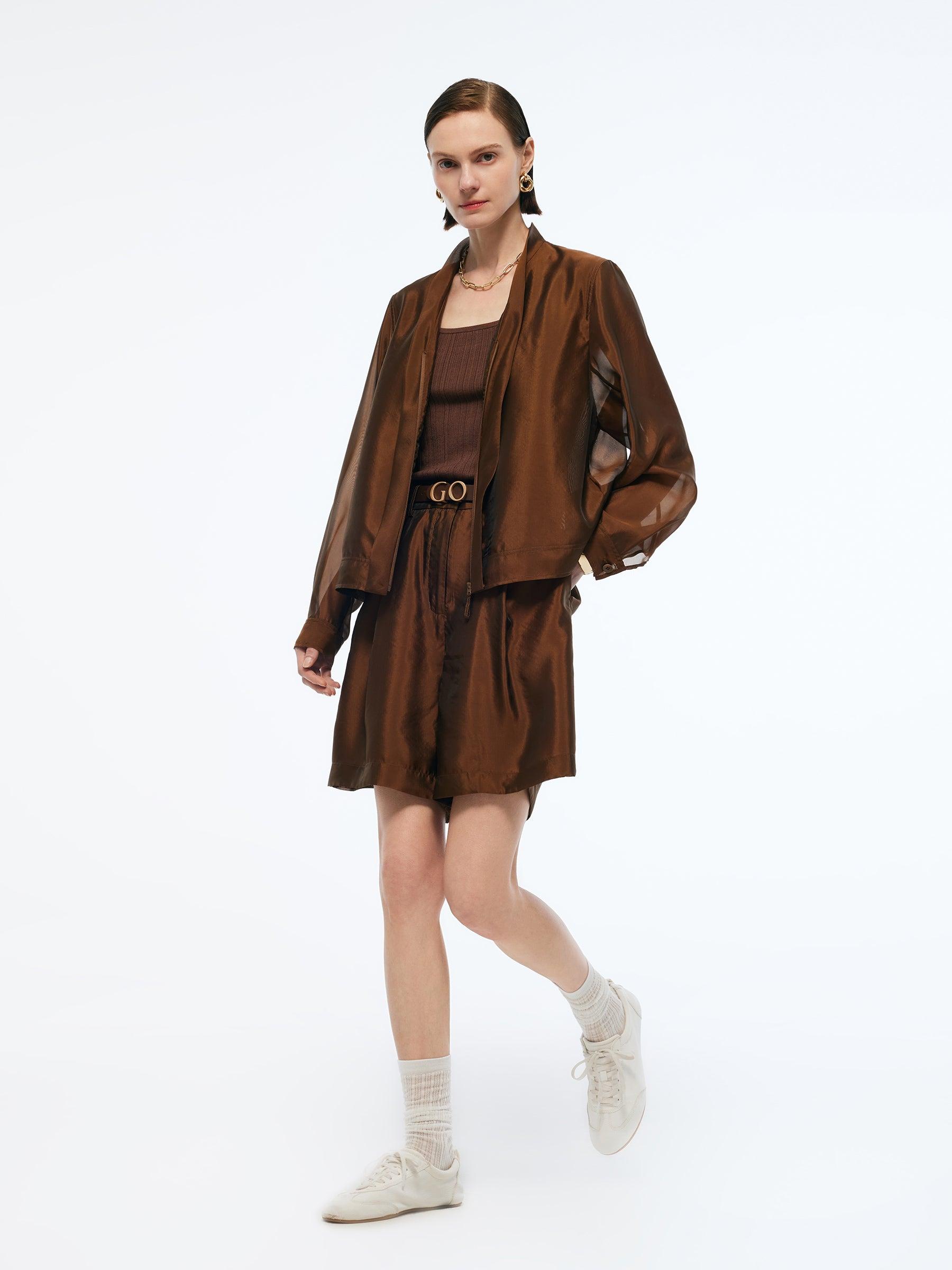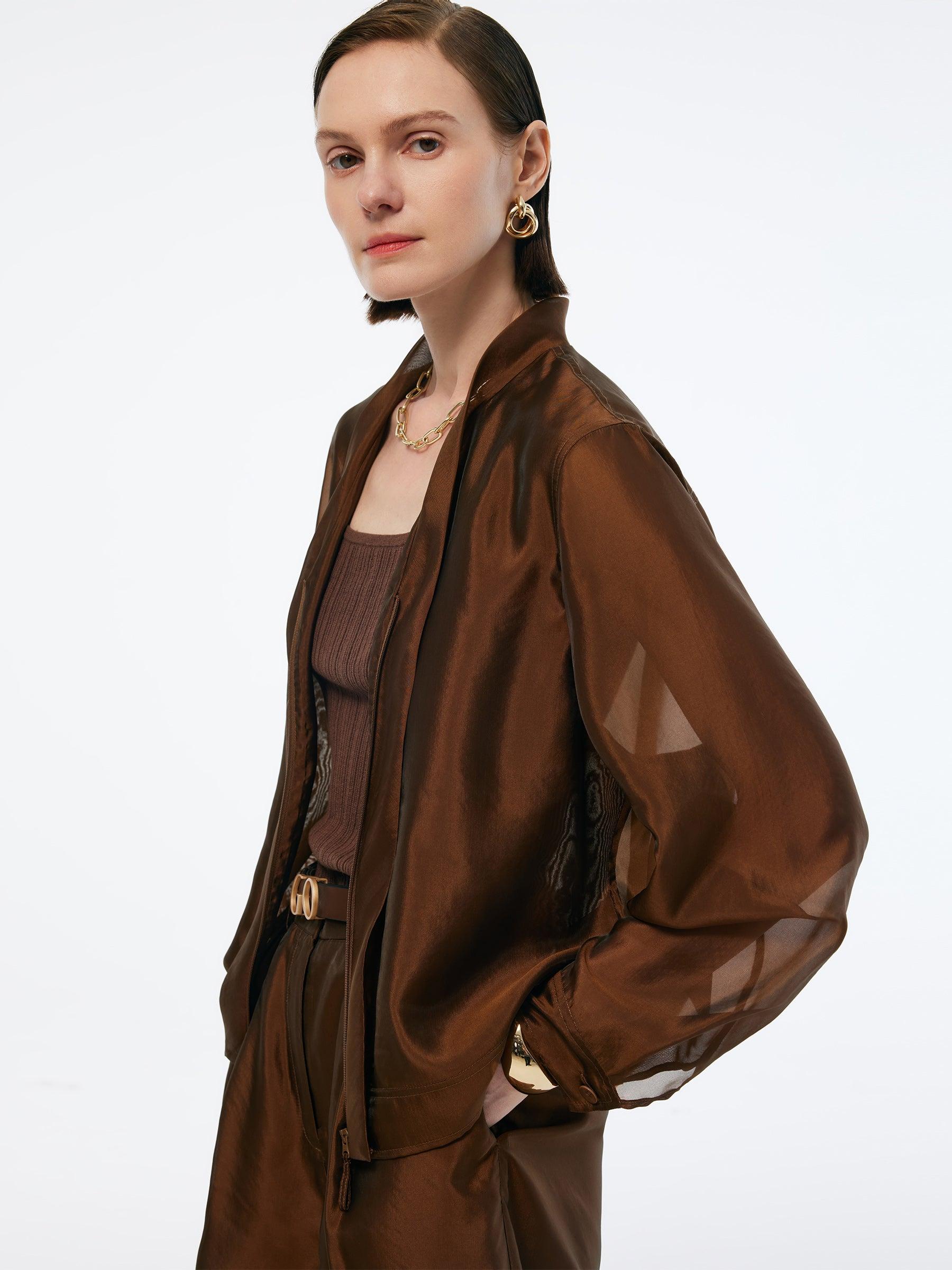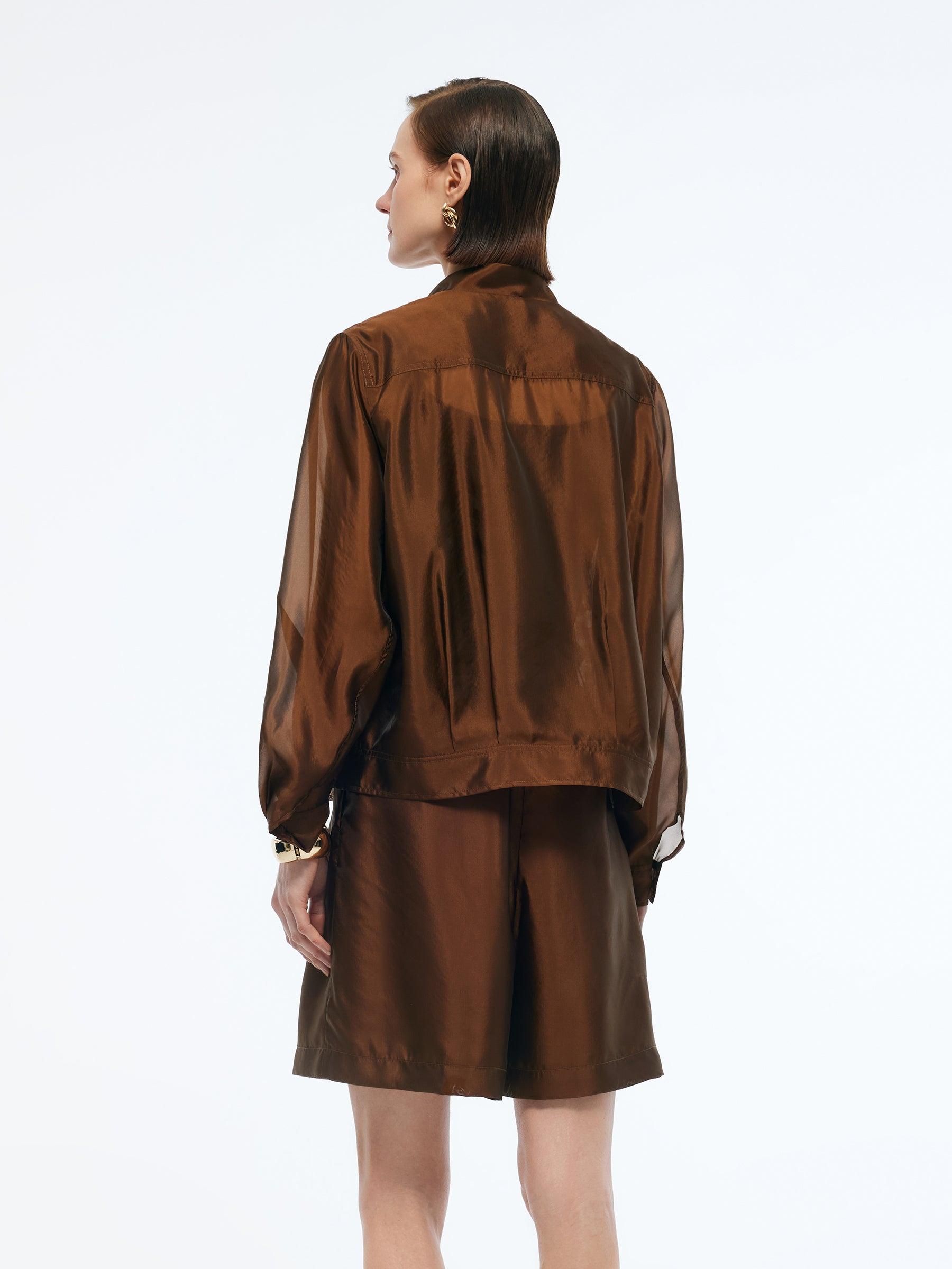 -Mulberry silk blend fabric -Inclusive -Machine washable Shaped in relaxed yet tailored fit with stand collar design, this mulberry silk blend zip-up jacket features a smooth and crisp handfeel, adding a modern twist to your wardrobe. The semi-sheer effect adds a touch of lightness and fluidity, making it a versatile p