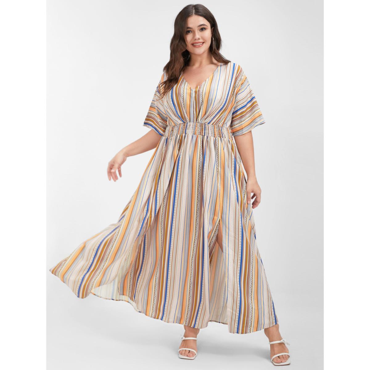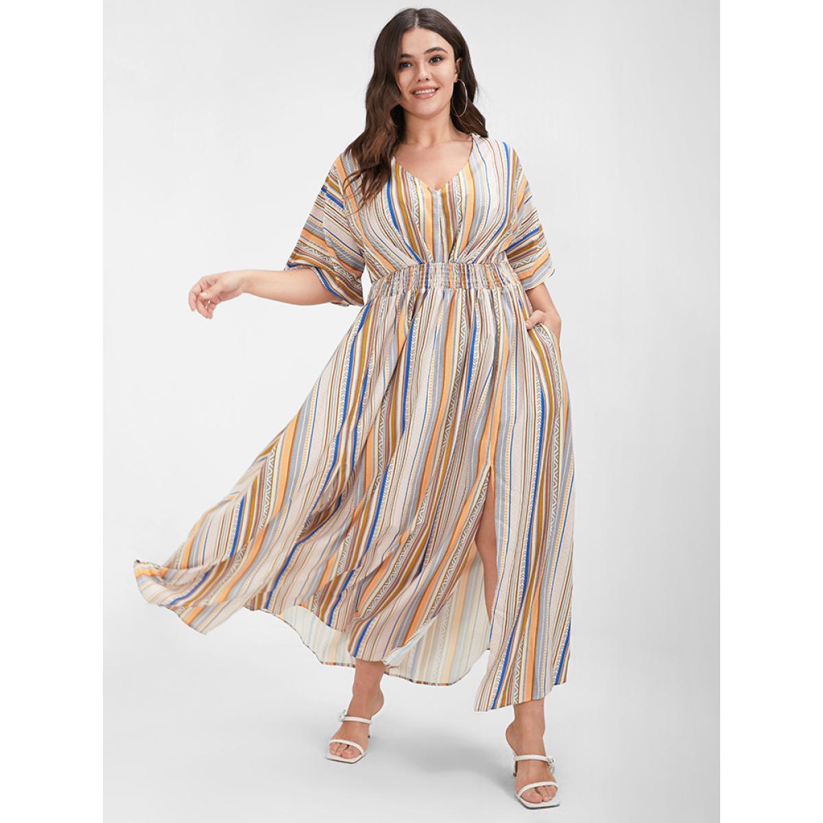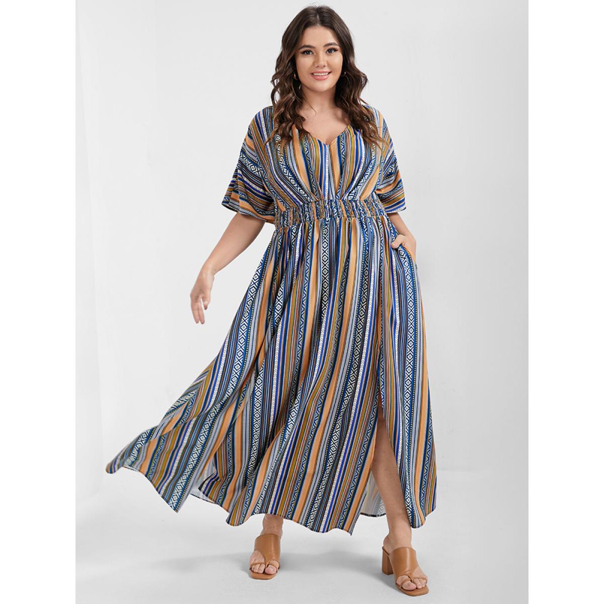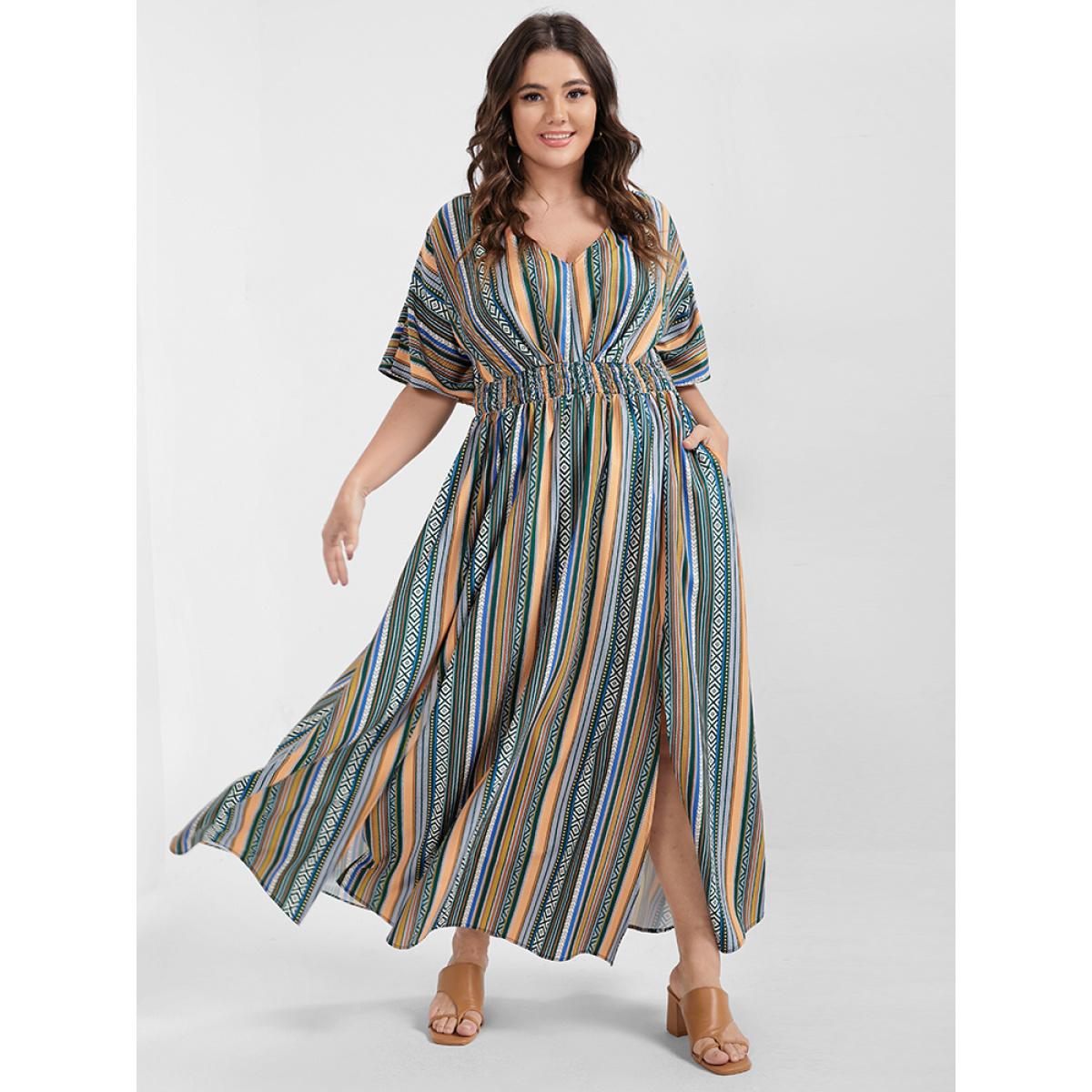 Multi Striped Bohemian Print Plus Size Women Maxi Dress Dailywear Elastic Waist Dolman Short Sleeve V Neck Pocket Vacation Dresses
