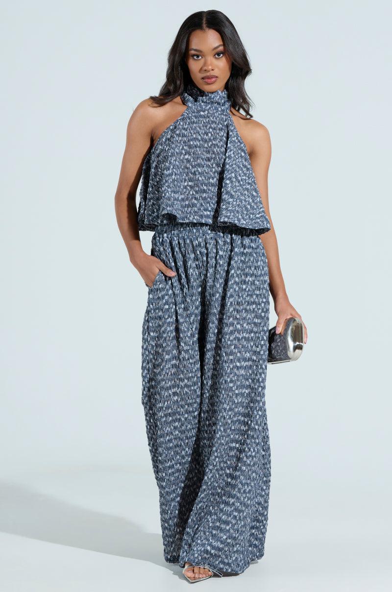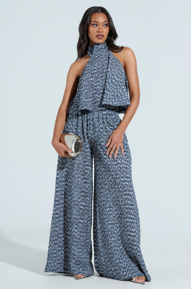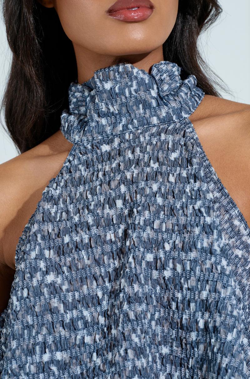 Summer is right around the corner in The AKIRA Label Multi Textured Sleeveless Peplum Top. This sweet piece is crafted from a super stretchy, textured fabrication and features a dreamy blue colorway, a mock neck, a sleeveless design, ruched detailing throughout, and a flouncy, peplum silhouette. Complete with a concealed back zipper closure and a cropped length. Style with the matching AKIRA Label Multi Textured Wide Leg Palazzo Pant, platform pumps, and a clutch for a finished look. - Shell: 90% Polyester 10% Spandex- Super Stretchy- Imported (all measurements approximate from size S/M)- 18” Neck to Hem- Model is 5’8” and is wearing size S/M Product ID: 1026288