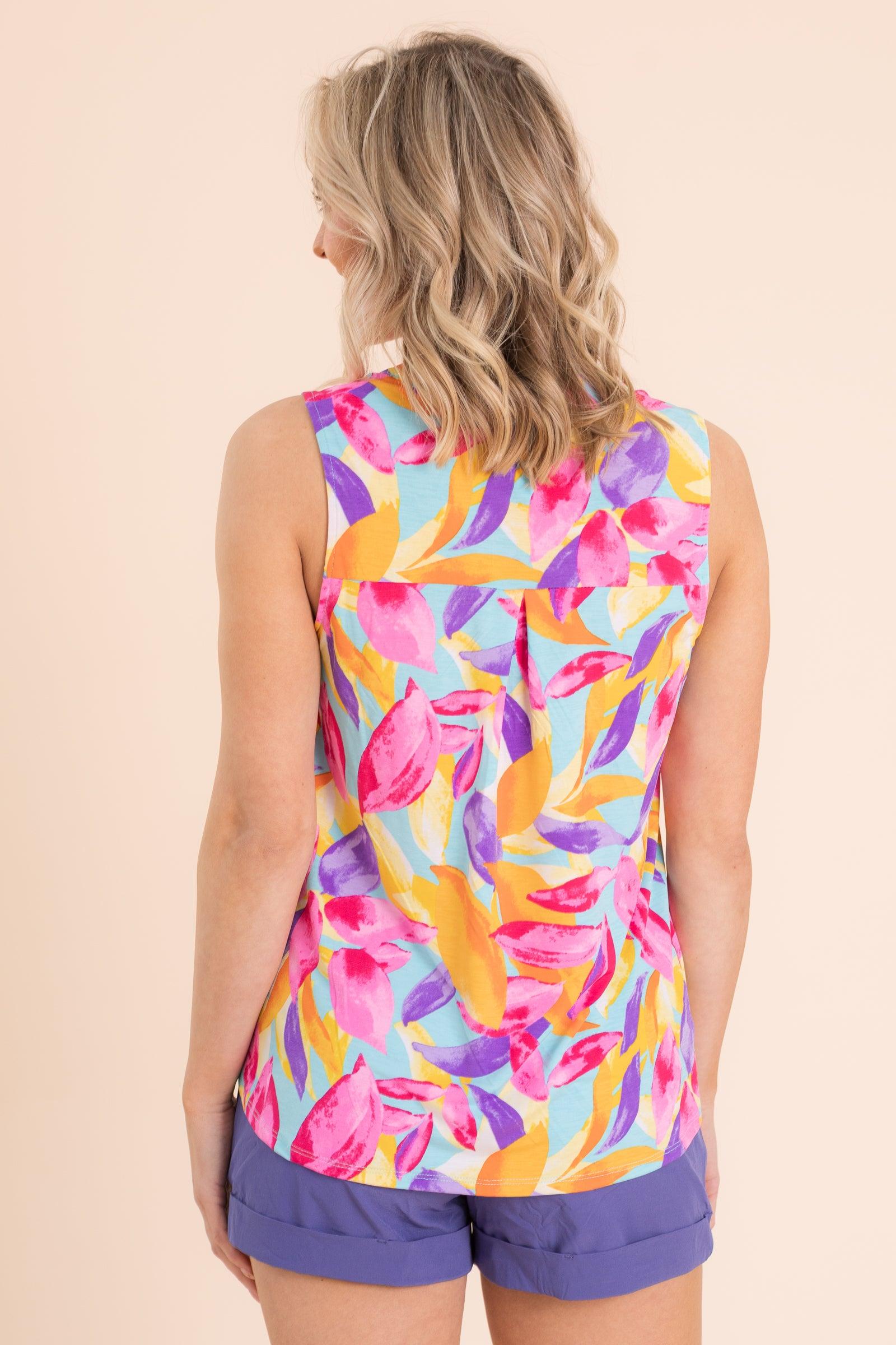 Product Details Colors: Pink, Marigold, Purple, Peach, Orange, Raspberry, Aqua Print: Floral Neckline: V-Neck Sleeves: Sleeveless Hemline: Round Brand: Dear Scarlett Material and Care 94% Polyester 6% Spandex Hand Wash Cold Line Dry Size and Fit Small: Bust 36" Waist 38" Length 26" Medium: Bust 38" Waist 40" Length 26.5" Large: Bust 40" Waist 42" Length 27" X Large: Bust 42" Waist 44" Length 27.5" 2X Large: Bust 45" Waist 47" Length 28.5" 3X Large: Bust 48" Waist 50" Length 29.5" Model is 5'8 and is wearing a size small