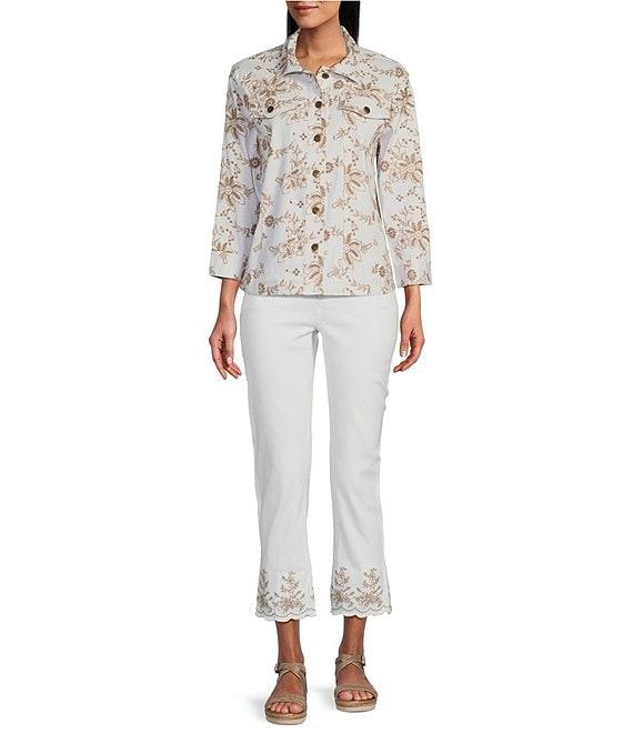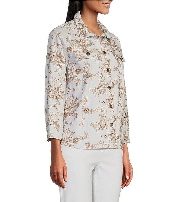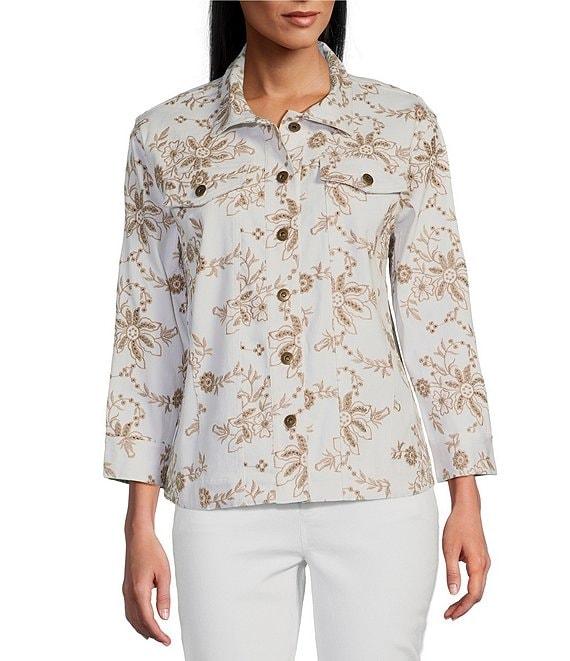 From Multiples, this jacket features: Twill fabrication Point collar neckline 3/4 cuff sleeves Fitted Allover embroidery Two faux flap front pockets Front yoke Straight hemline Button-front closure Approx. 25" length Cotton/spandex Machine wash/tumble dry low Imported.