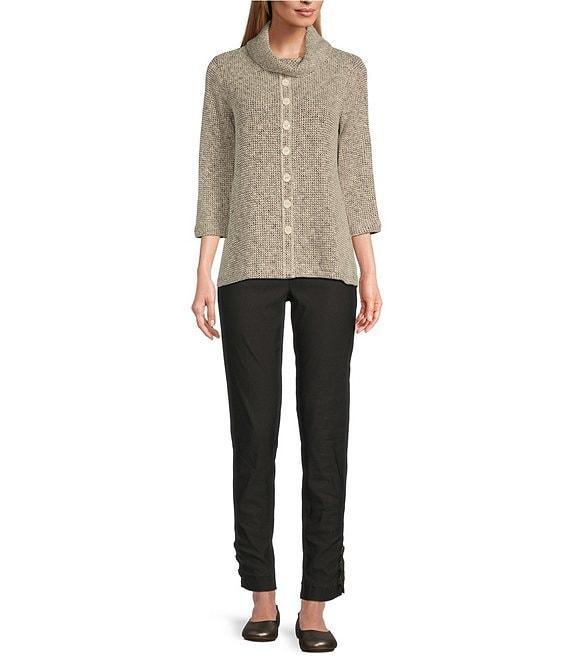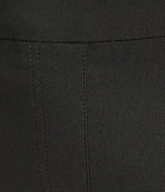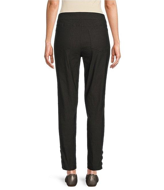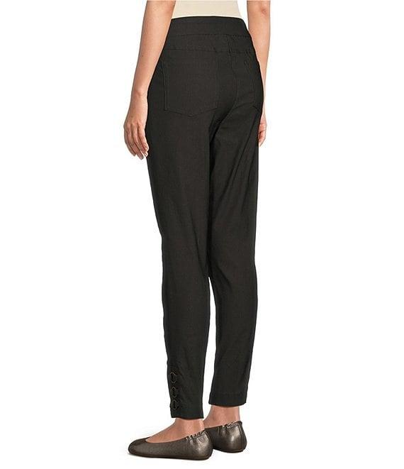 From Multiples, these pants feature: Solid fine line twill fabrication Straight leg silhouette with ring hem vents Elastic waistband Flat front Pull-on construction Approx. 28" inseam; 10.75" front rise; 16.5" back rise Rayon/nylon/spandex Machine wash/tumble dry Imported.
