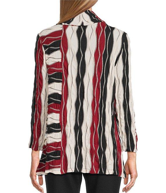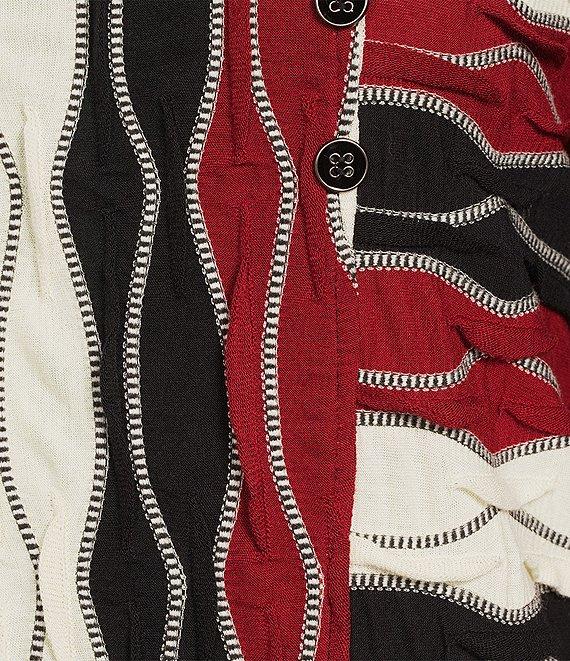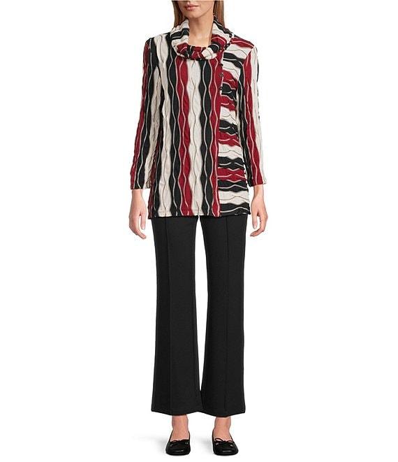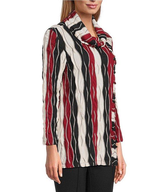 From Multiples, this top features: Jacquard knit fabrication Cowl neckline 3/4 sleeves Wavy stripe pattern Button on seam detail Straight hem Pullover construction Approx. 26.5" length Rayon/polyester/spandex Machine wash/line dry Imported.