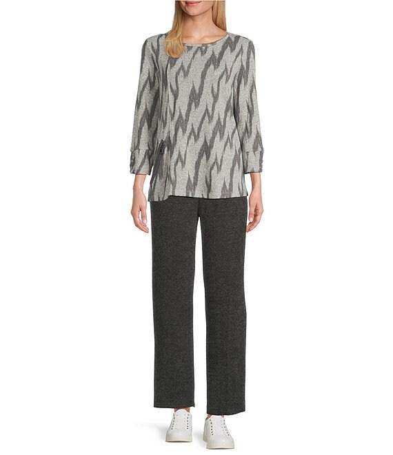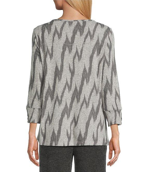 From Multiples, this top features: Stretch knit fabrication Scoop neckline 3/4 sleeves with three-button detail at cuff Side zip pocket Straight hem Pullover construction Approx. 27" length Polyester/spandex Turn inside out/machine wash cold Imported.