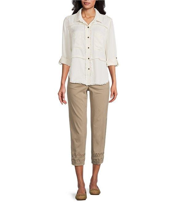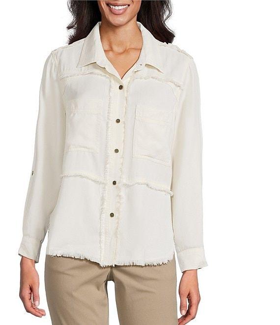 From Multiples Petite, this shirt features: Lyocell twill fabrication Point collar neckline Long roll-tab sleeves with button cuff Two functional patch pockets Yoke with back pleats Fringed detailing Curved hem Button-front closure Approx. 26" length Lyocell Turn garment inside out-machine wash cold Imported.