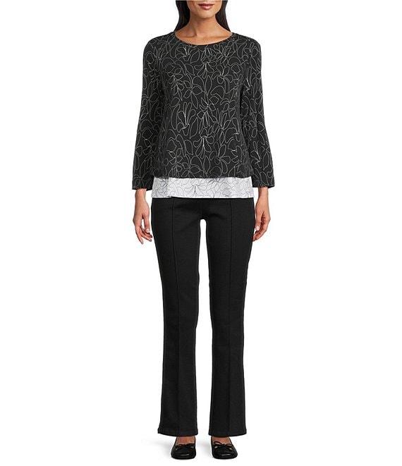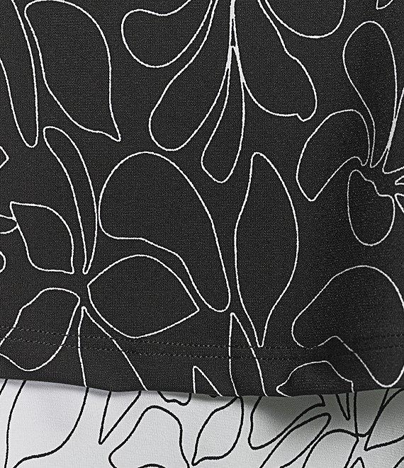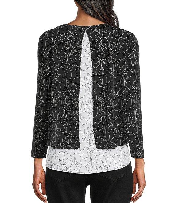 From Multiples Petite, this top features: Knit fabrication Scoop neckline 3/4 sleeves Fitted Monochrome floral print Split back layered Hi-low hem Pullover construction Approx. upper front 20.5" length, lower front 23.5" length Approx. 25" back length Polyester/spandex Turn inside out-machine wash cold Imported.