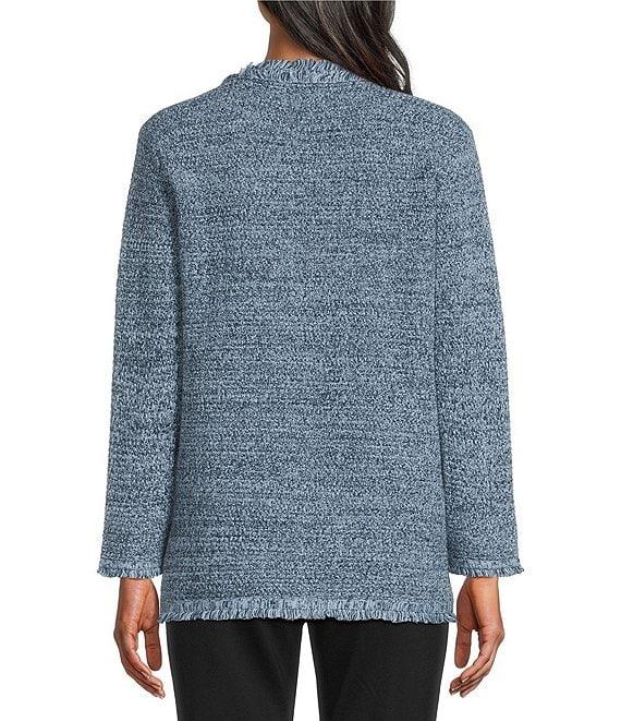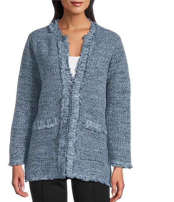 From Multiples Petite, this jacket features: Novelty textured knit fabrication Open neckline Long sleeves Fringe trim detail Two functional front pockets Open front; no closure Approx. 26" length Nylon Place in garment bag-machine wash cold Imported.