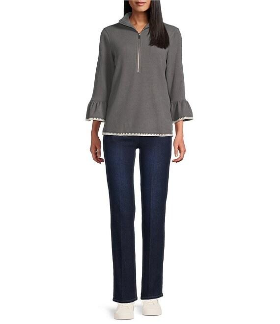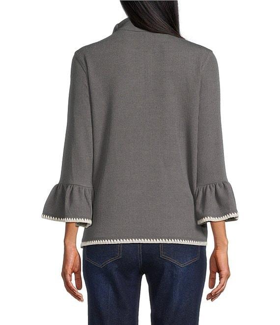 From Multiples Petite, this top features: Ribbed knit fabrication Funnel neckline 3/4 flounce sleeves Blanket stitch trim on edges Straight hem Zip-front closure Approx. 23" length Polyester/rayon/spandex Place in garment bag-machine wash cold Imported.