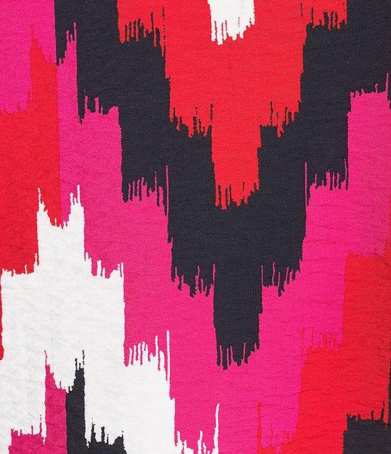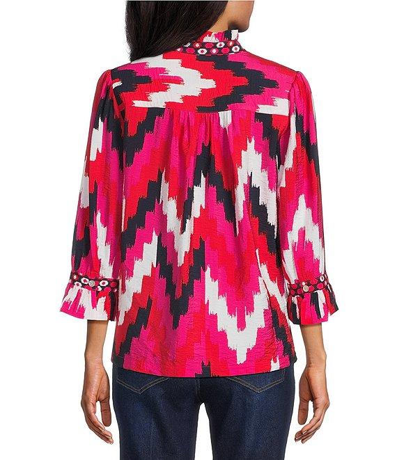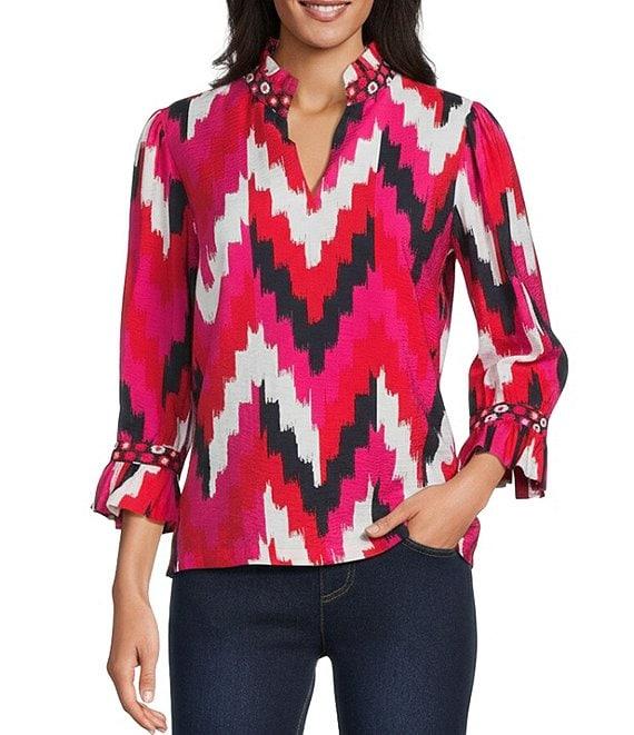 From Multiples, this top features: Woven fabrication Ruffled stand collar 3/4 flounce cuff sleeves Chevron print Fitted Curved hem with side vents Pullover construction Approx. 26.25" length Rayon/nylon Turn inside out/machine wash cold Imported.