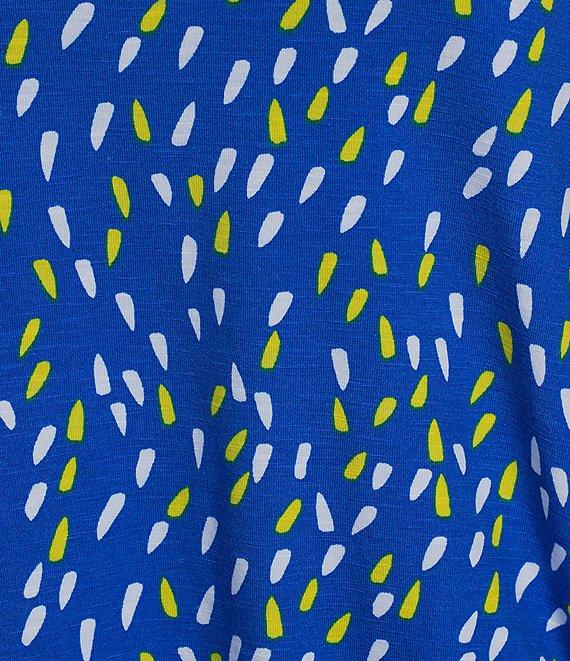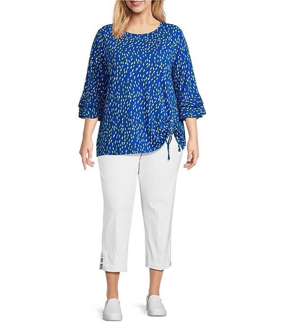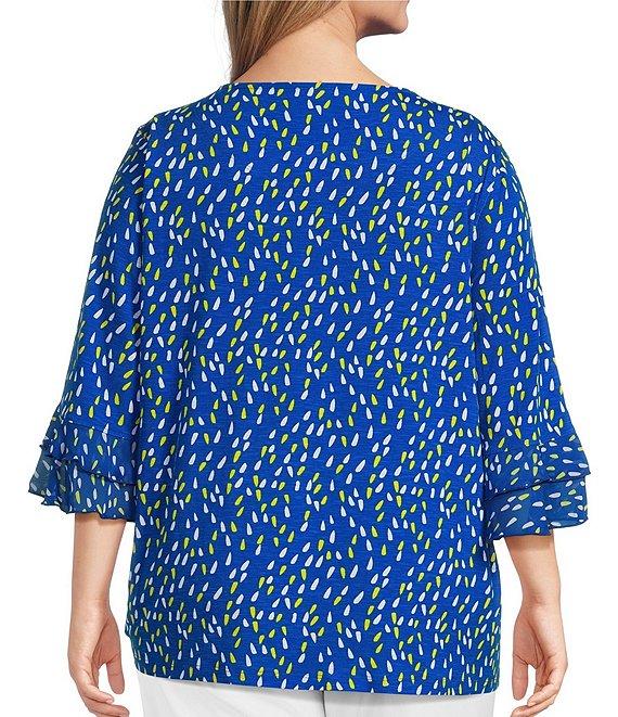 From Multiples Plus, this top features: Slub knit georgette stretch fabrication Boat neckline 3/4 double flounce sleeves Dot multi print Fitted Straight hemline with a ruched side drawstring Pullover construction Approx. 29" untied length, 28" tied length Polyester/spandex Machine wash/tumble dry Imported.