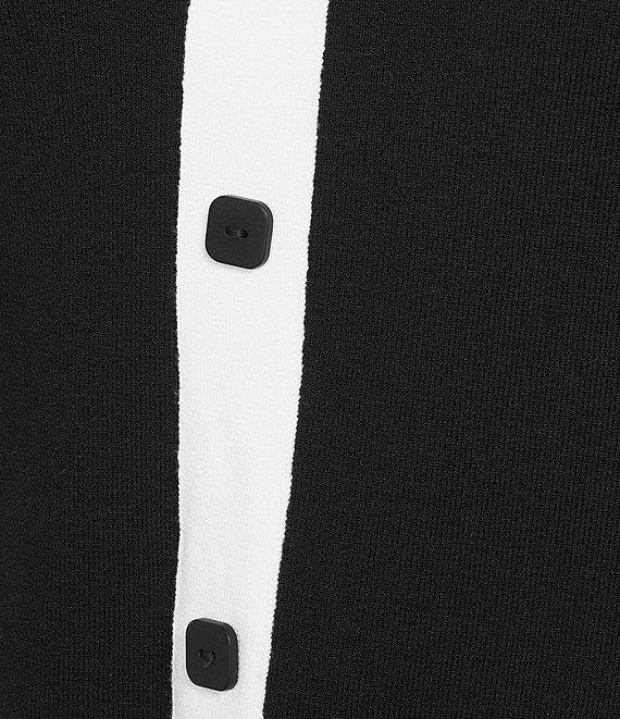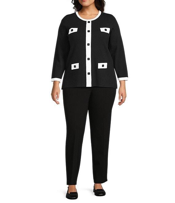 From Multiples Plus, this top features: Sweater knit fabrication Wide neckline 3/4 sleeves Fitted Contrast trim Faux pockets Straight hem with side vents Pullover construction Approx. 27.5" length Viscose/polyester/nylon Place in garment bag-machine wash cold Imported.
