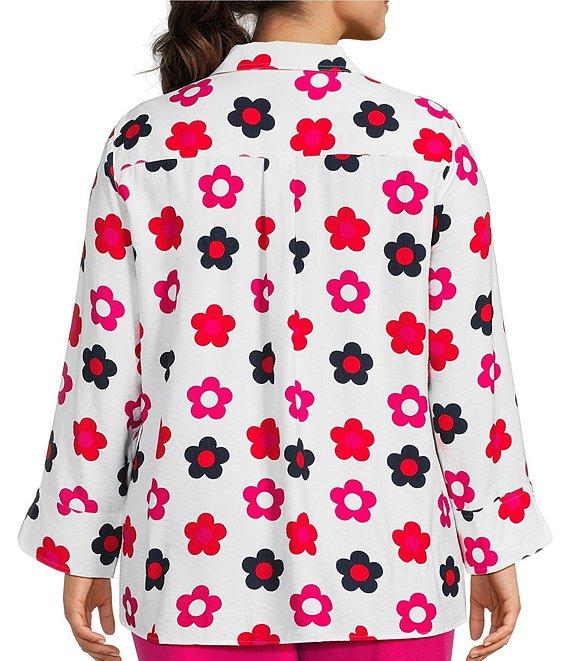 From Multiples Plus, this shirt features: Woven fabrication Point collar 3/4 turn-up cuffs sleeves Fitted Multi print Functional side seam pockets Yoke with pleat Shaped hemline Button-front closure Approx. 30" length Rayon/nylon Turn inside out/machine wash cold Imported.